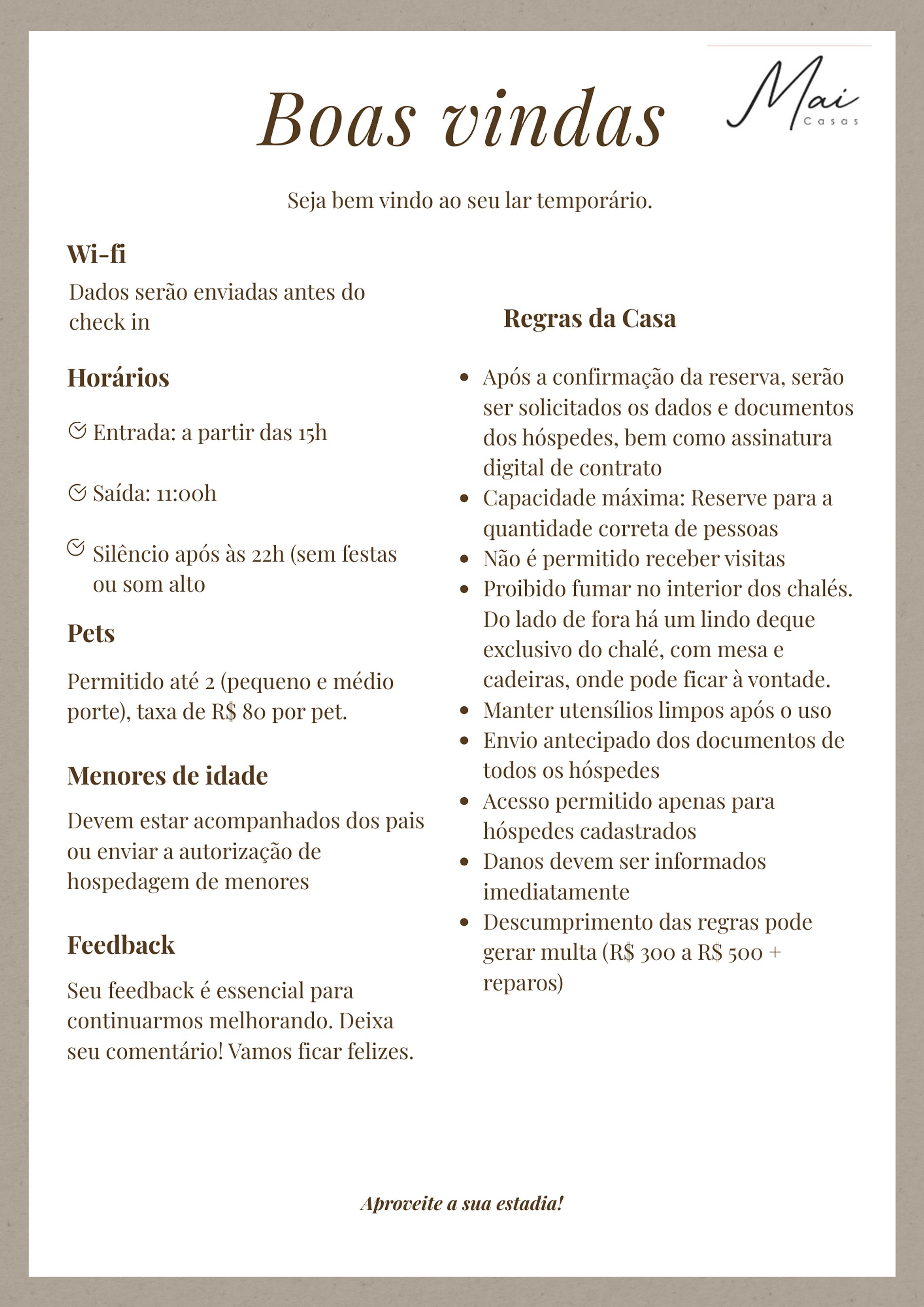 Para segurança e organização da hospedagem, solicitamos o envio prévio do nome completo e documento de todos os hóspedes para cadastro.