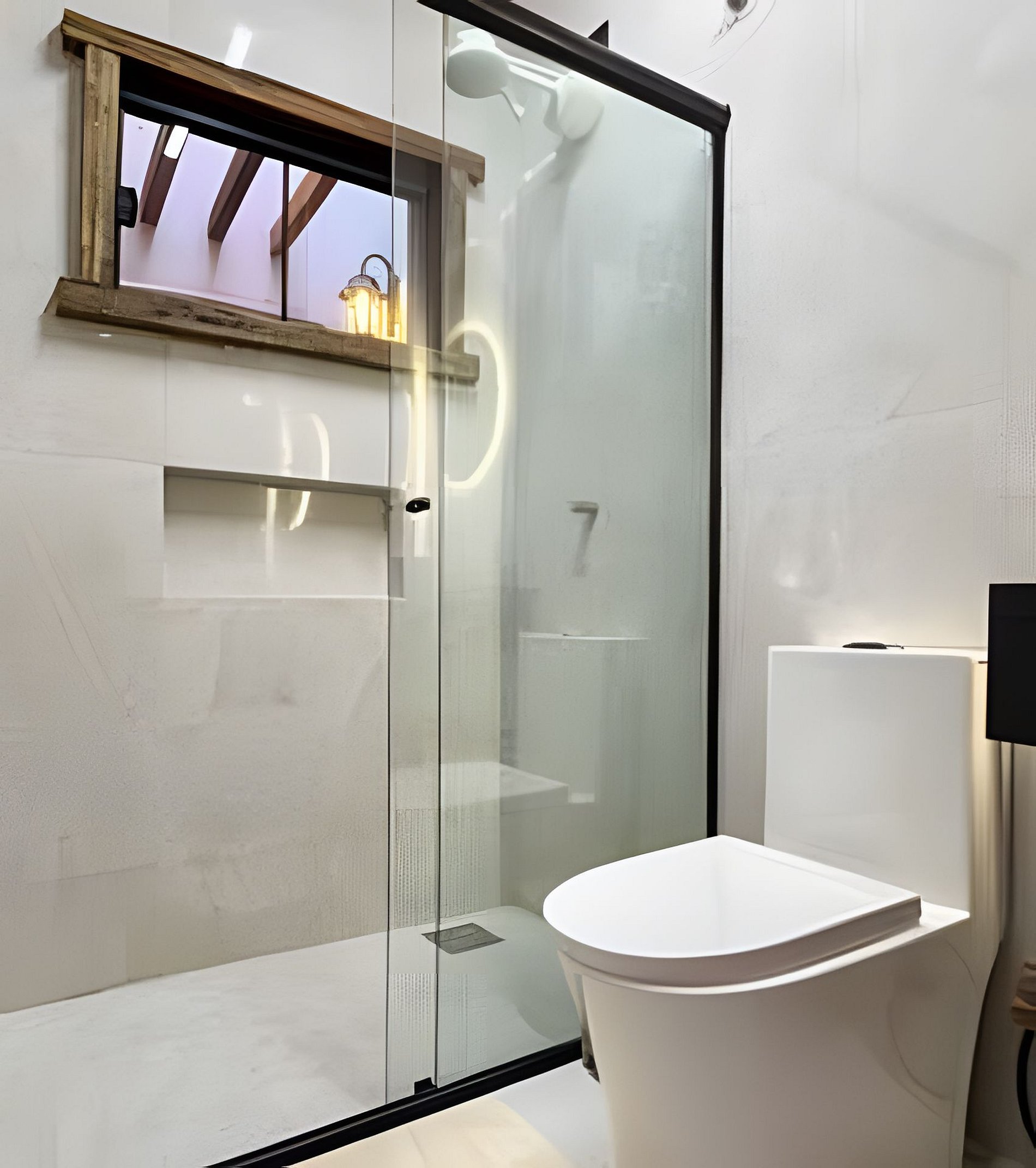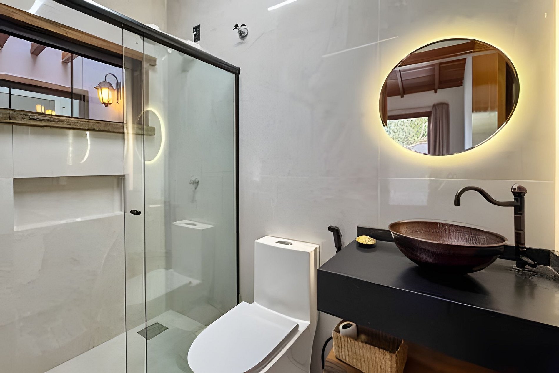 • Banheiro moderno com acabamento rústico-chique