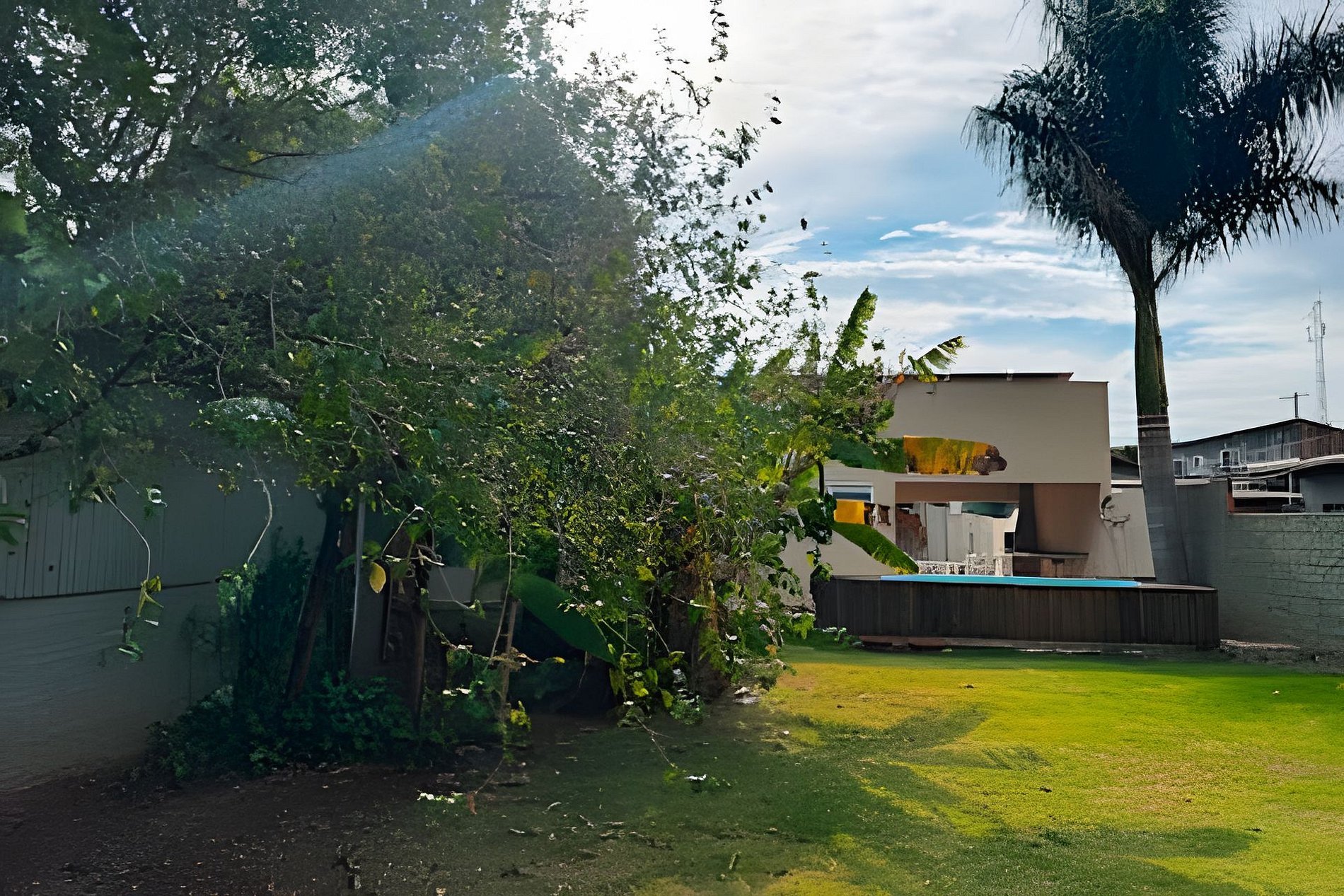 • Quintal amplo com gramado e árvores