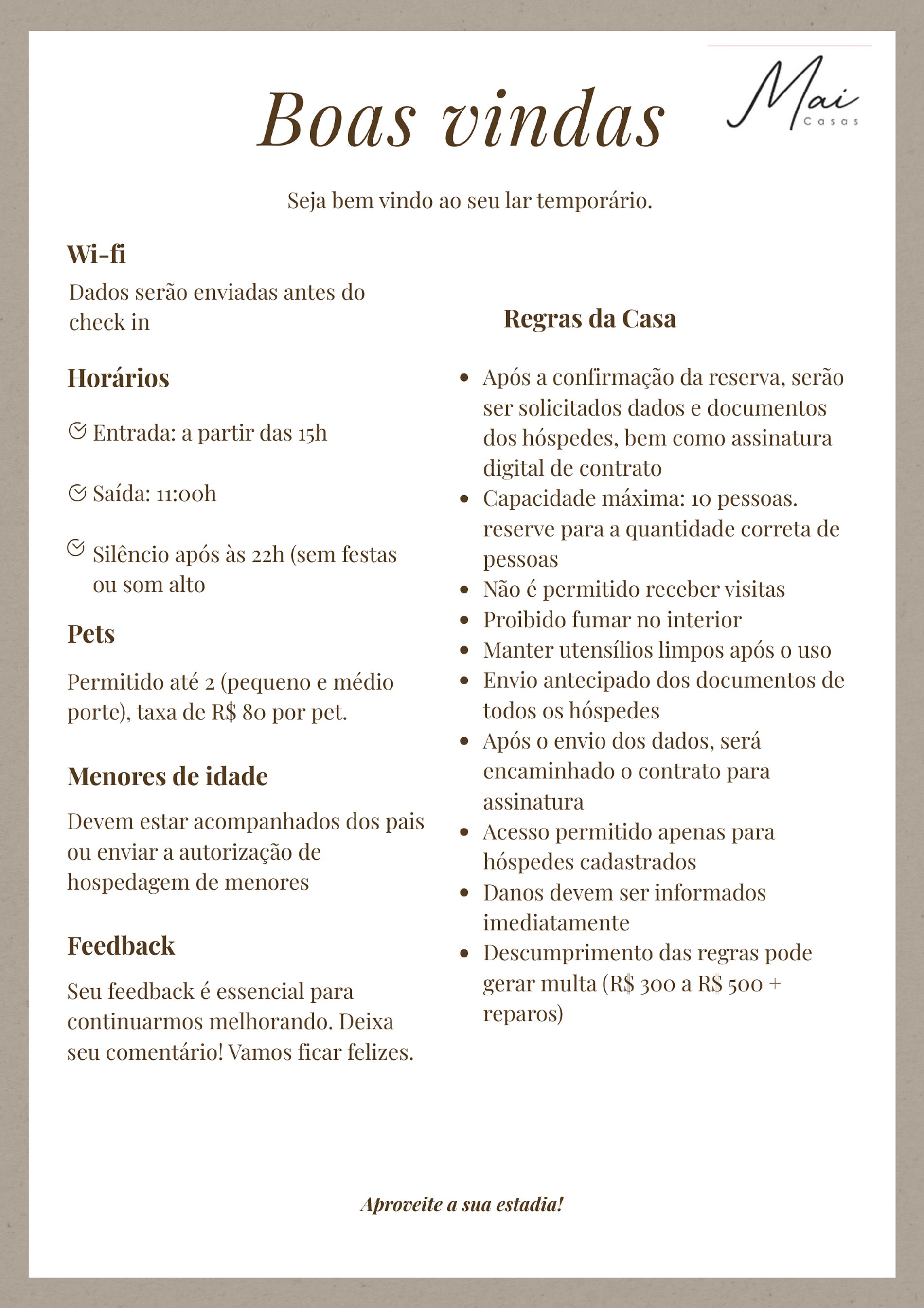 • Pets: até 2 (pequeno porte), taxa de R$ 80 por animal. Fale com a nossa equipe para incluir o 2º pet