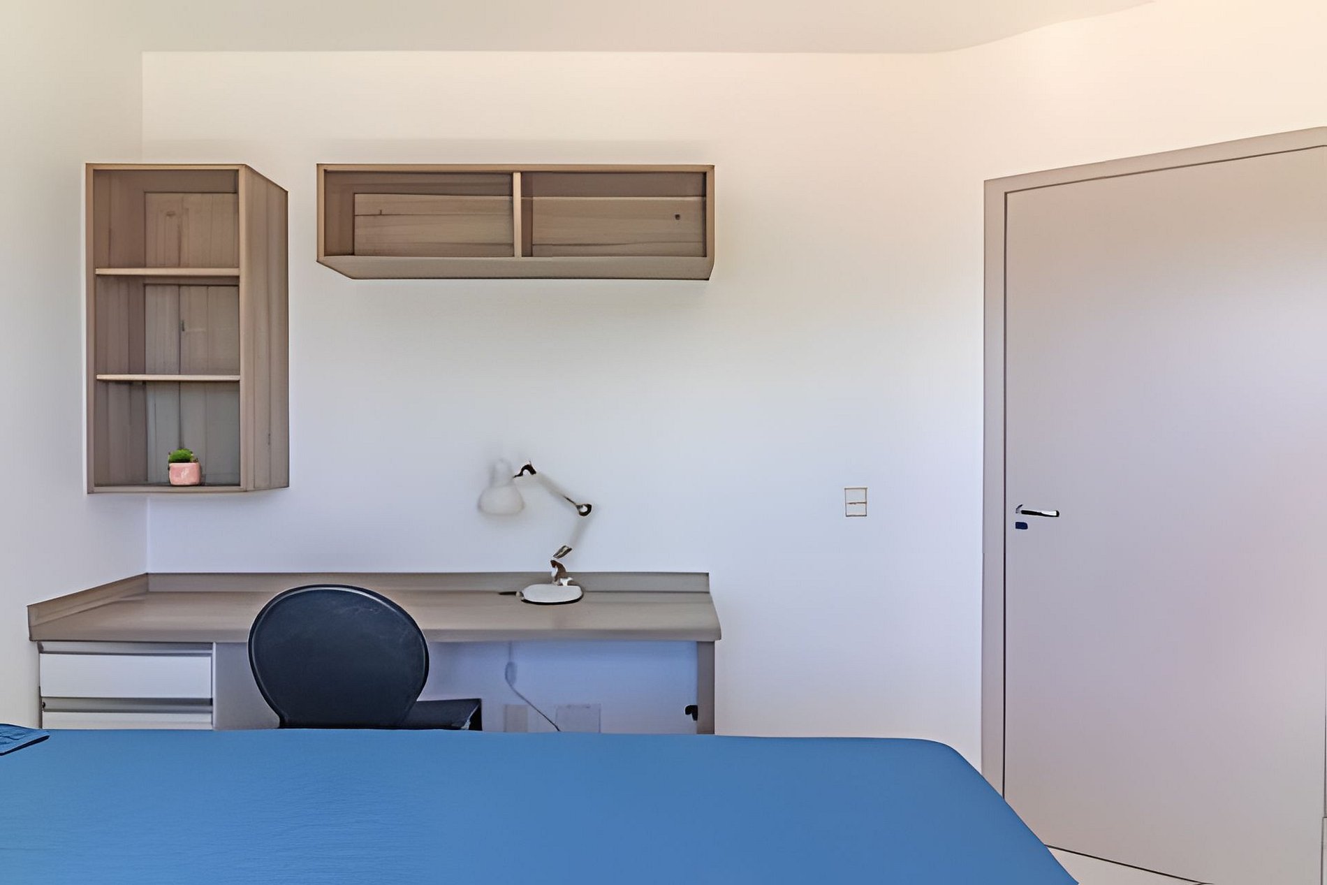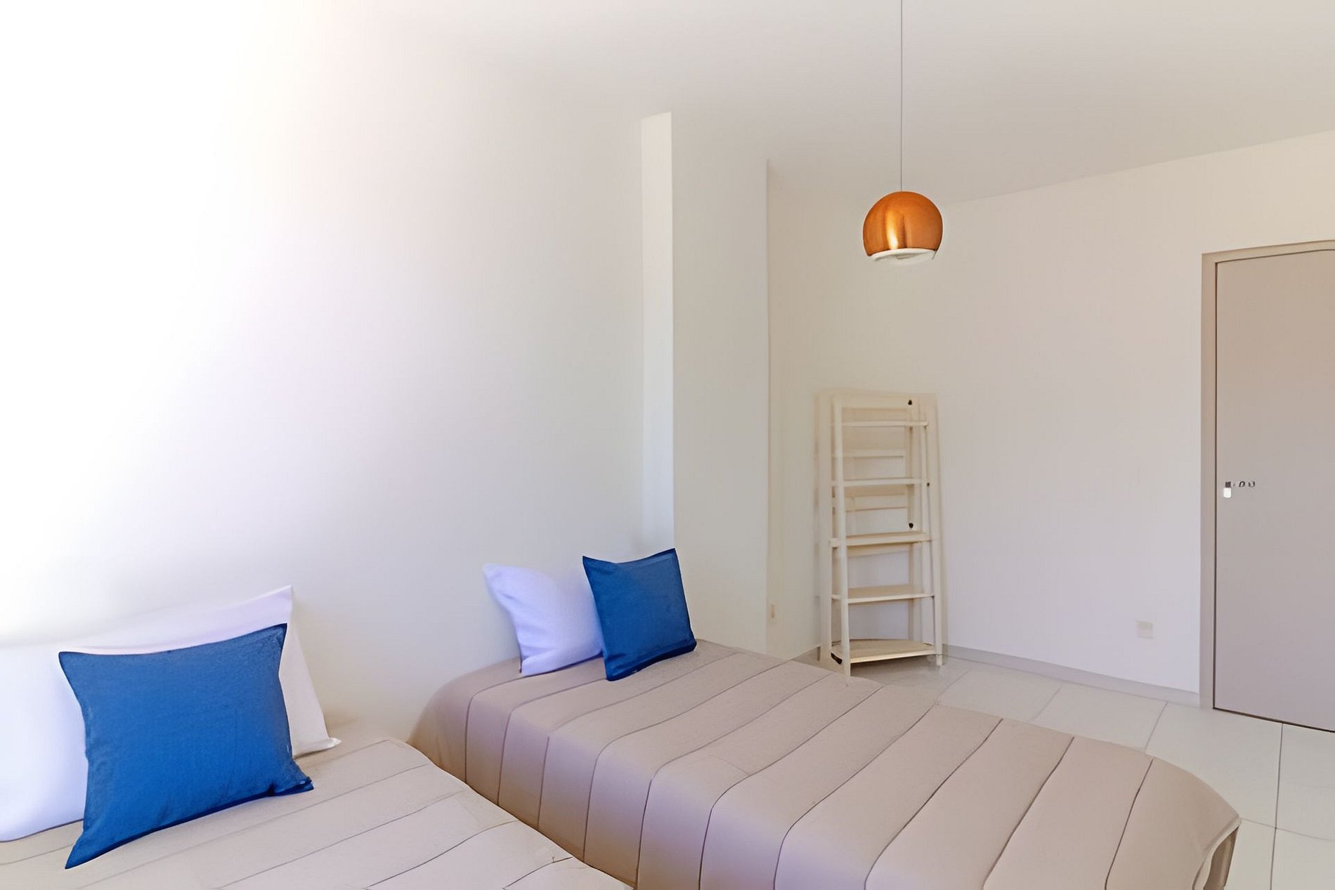• Um quarto com duas camas de solteiro e prateleira.