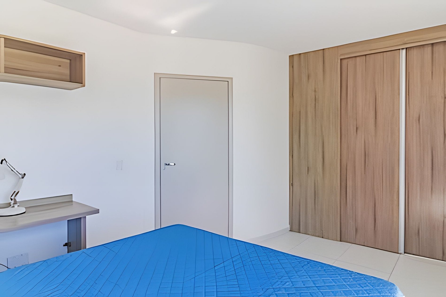 • Um quarto com cama de casal, mesa, cadeira e closet.