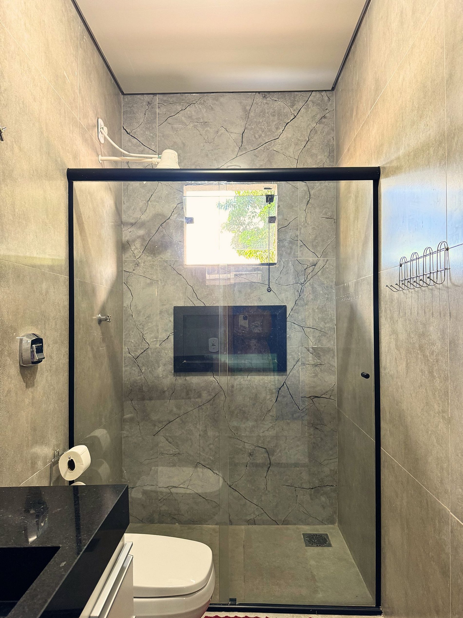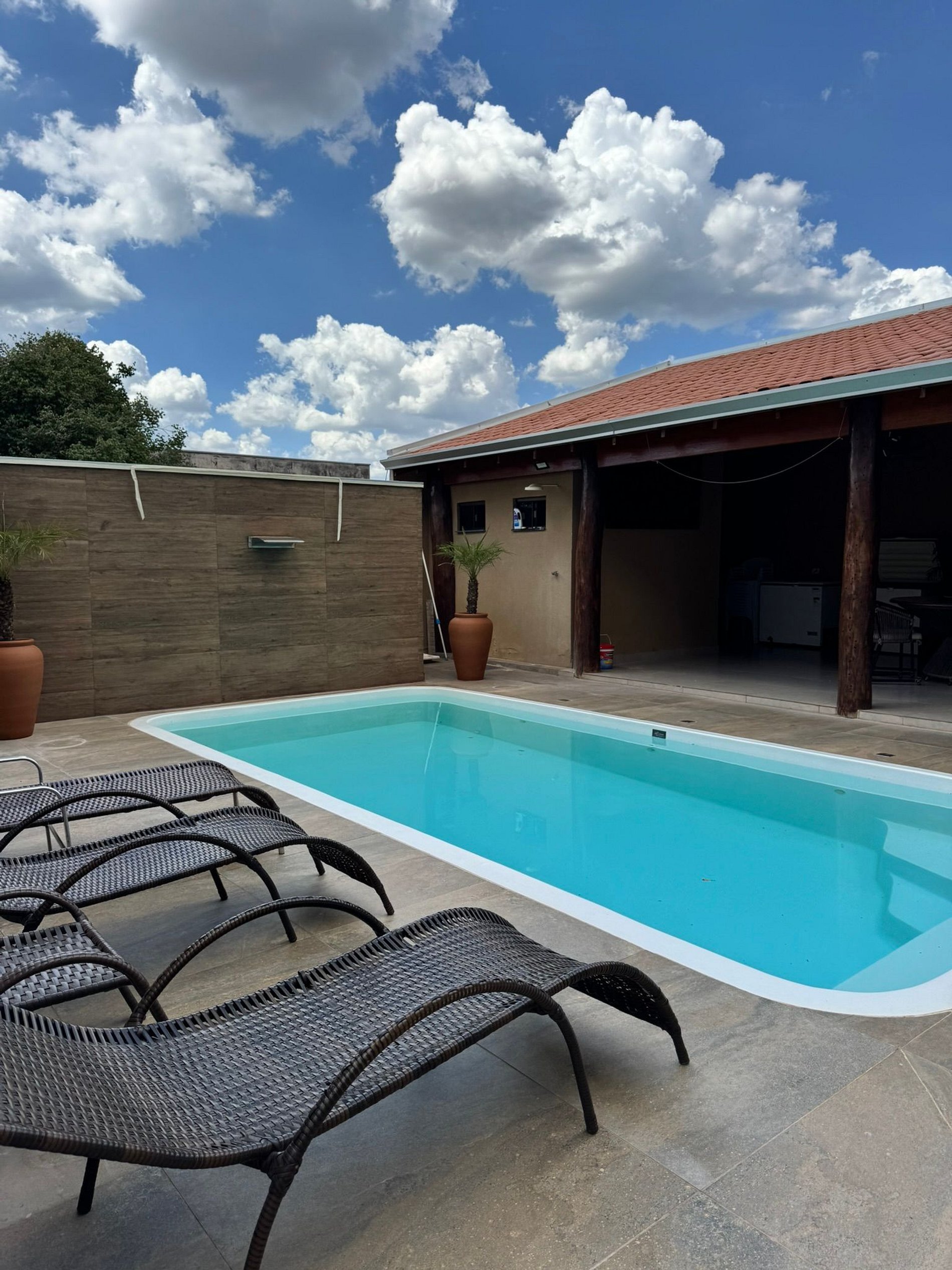 O espaço faz parte de uma propriedade com outras suítes e uma casa principal, todas com acesso por um agradável quintal compartilhado. Na área comum, os hóspedes podem aproveitar piscina, churrasqueira, cozinha equipada (com airfryer e liquidificador), além de banheiros feminino e masculino de apoio.