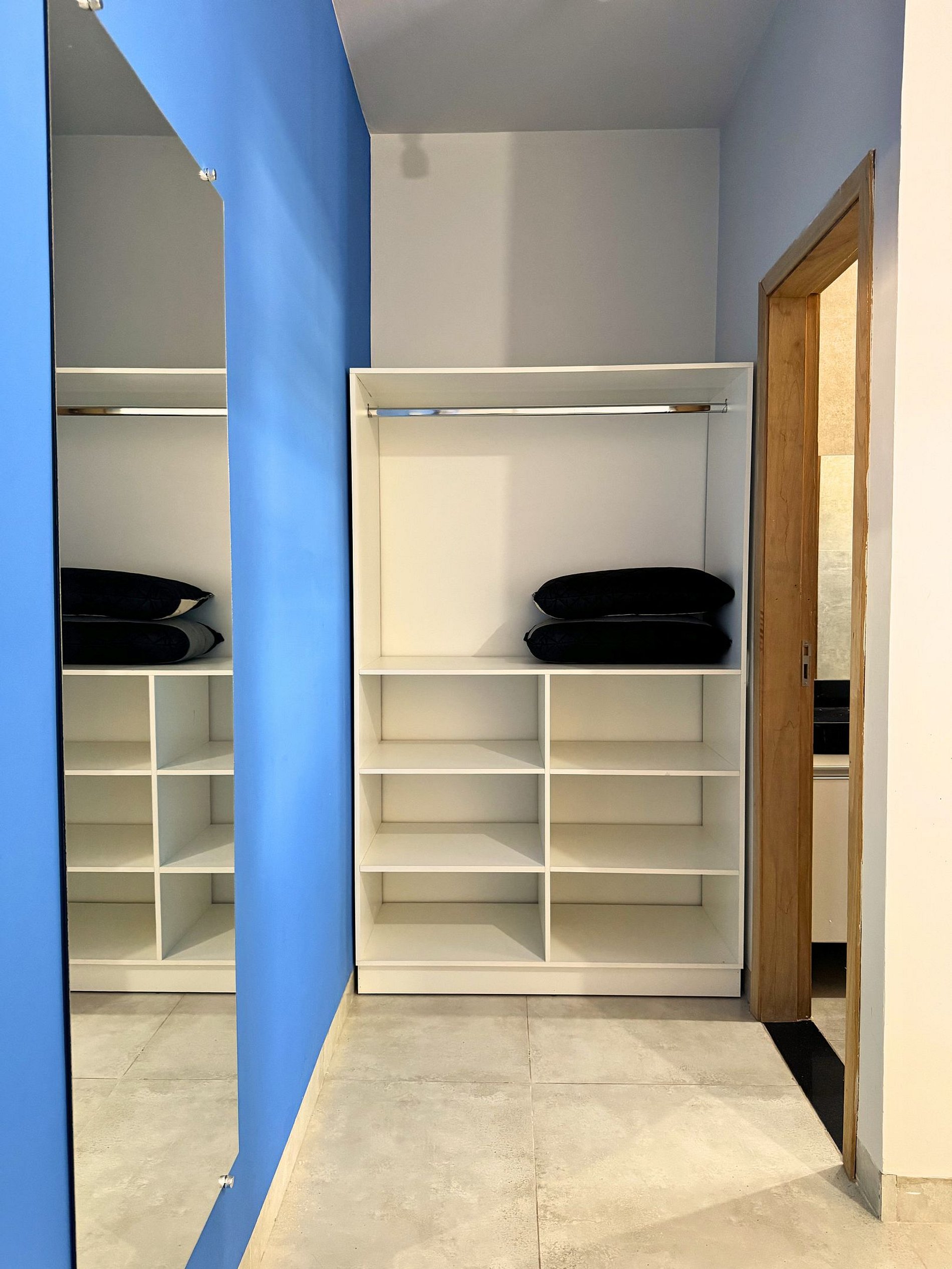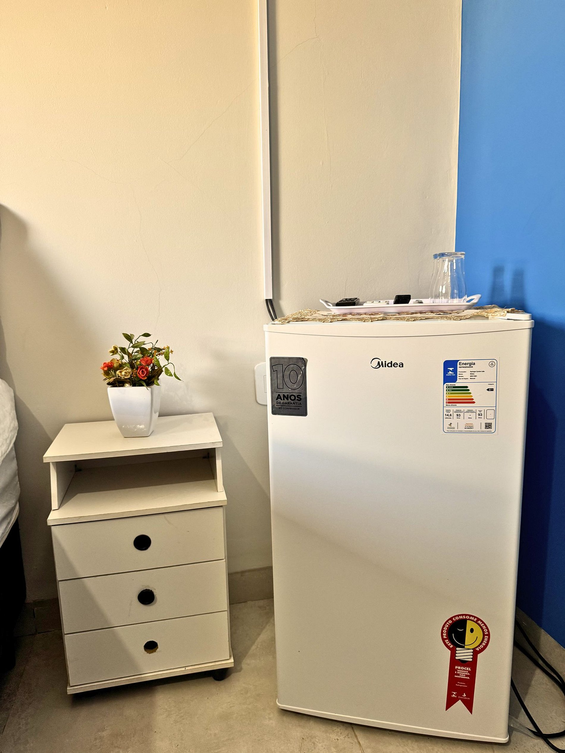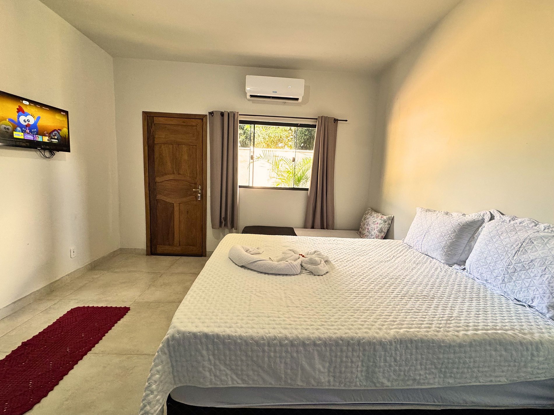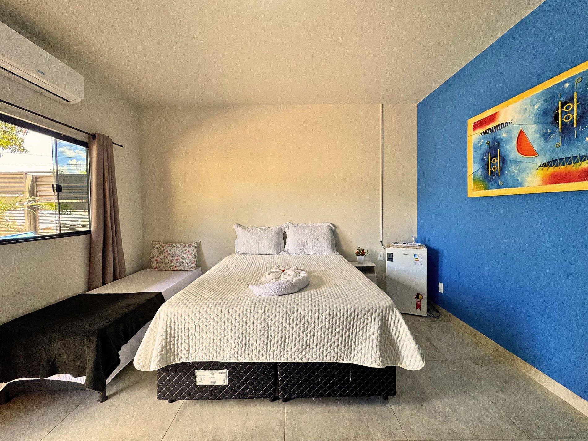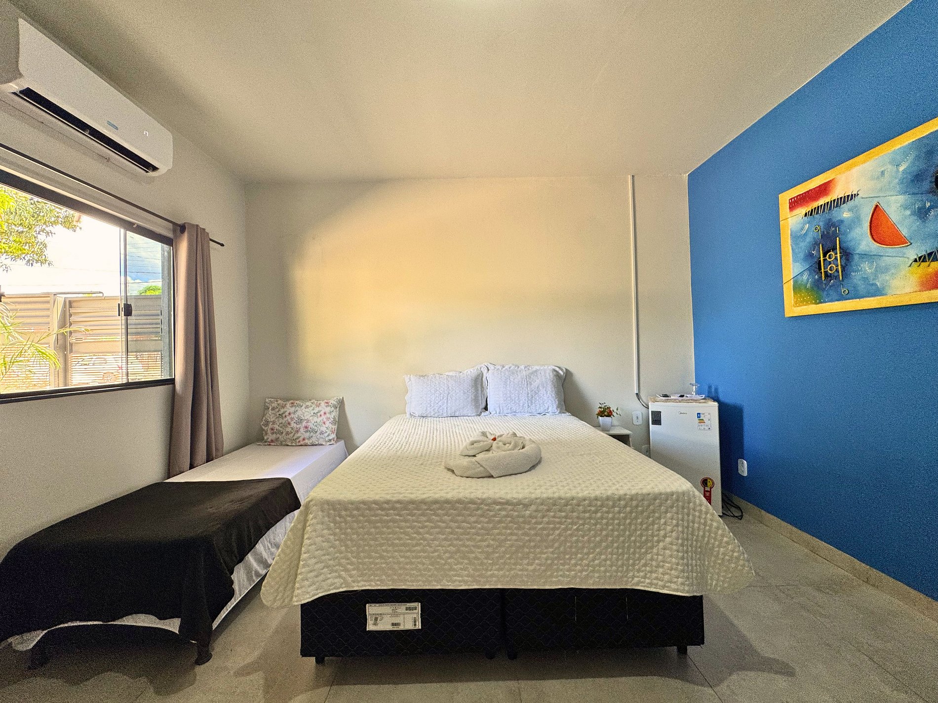 • A suíte é privativa e funcional, equipada com cama queen, cama de solteiro, ar-condicionado, TV Smart, frigobar e banheiro completo, oferecendo conforto para estadias curtas ou mais longas.