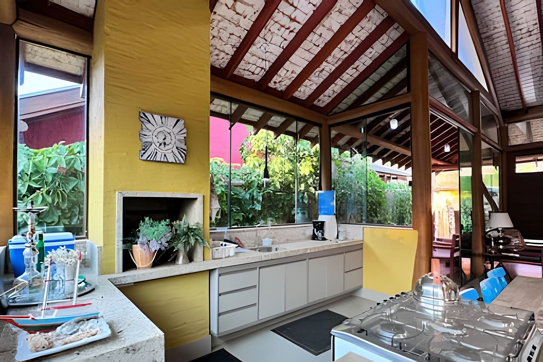 **A churrasqueira interna da casa está desativada, mas que há duas churrasqueiras excelentes que estão disponíveis para o uso dos hóspedes na área de lazer do condomínio.**