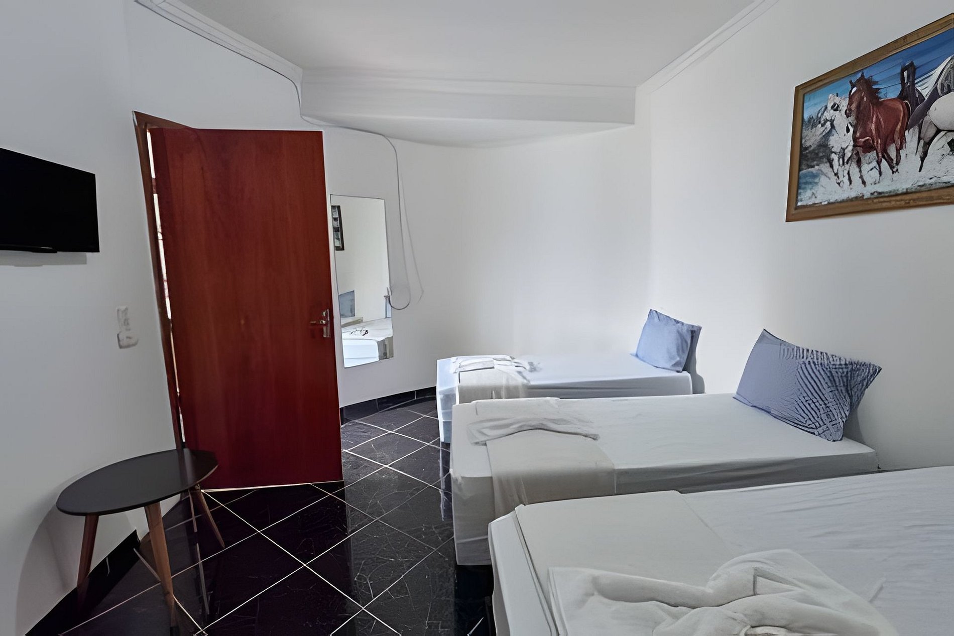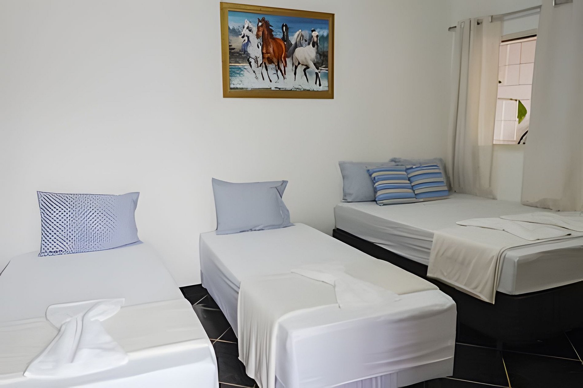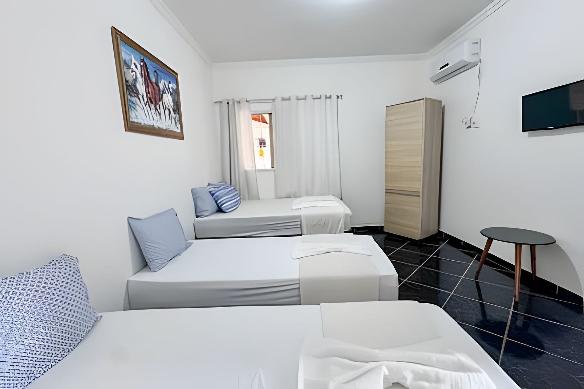 A configuração dos quartos é: 1. Suíte com cama de casal, ar condicionado, tv e varanda; 2. Quarto com cama de casal, ar condicionado e varanda; 3. Quarto com cama de casal e ar cond.; 4. Quarto com uma cama de casal e duas de solteiro, ar cond. e tv.