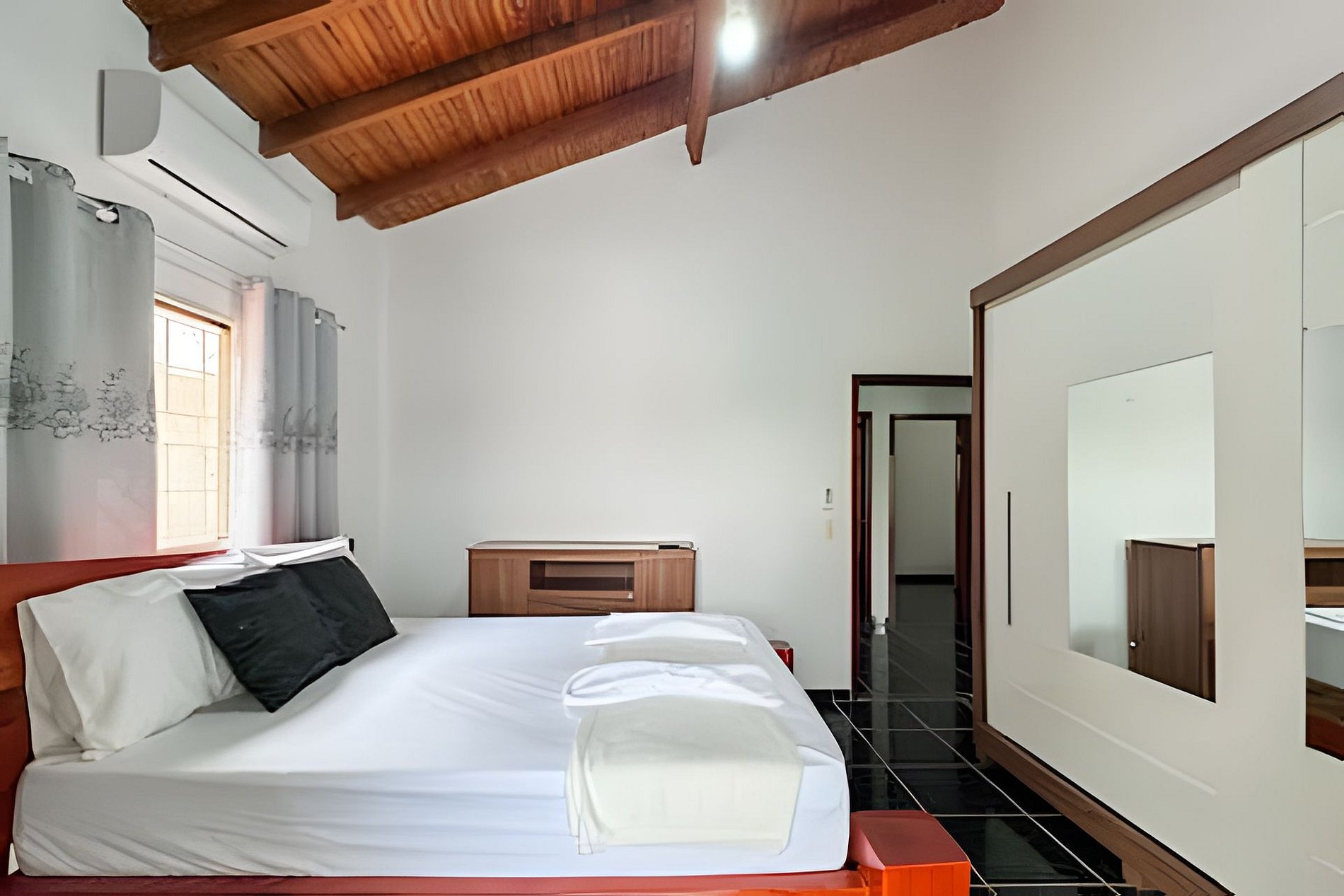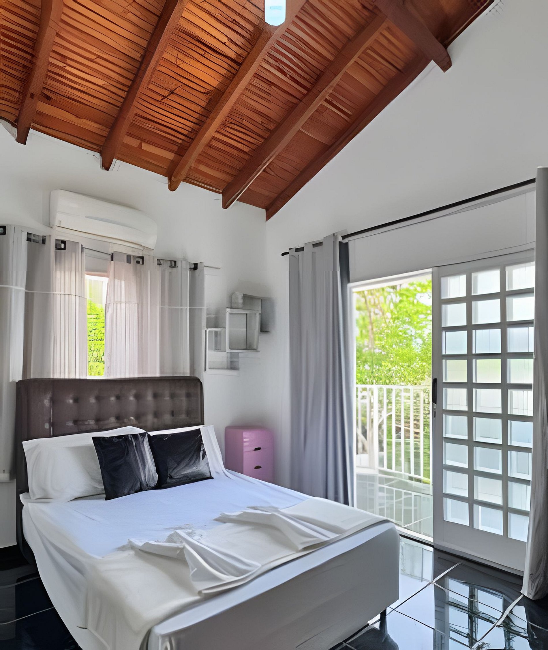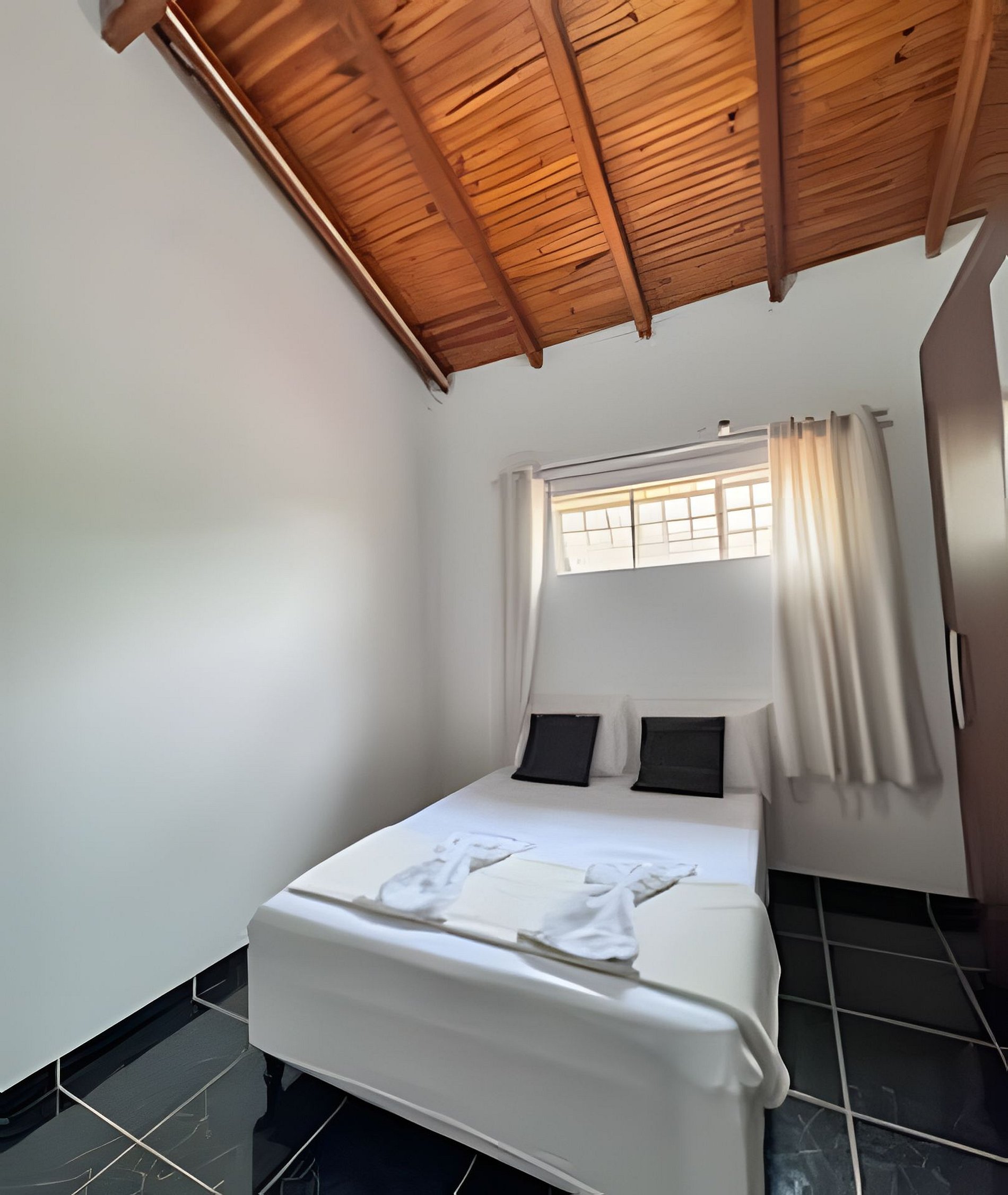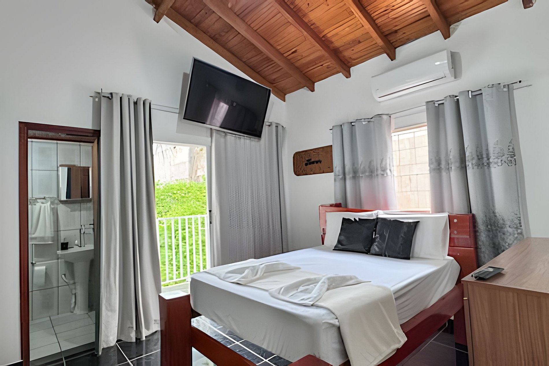 A configuração dos quartos é: 1. Suíte com cama de casal, ar condicionado, tv e varanda; 2. Quarto com cama de casal, ar condicionado e varanda; 3. Quarto com cama de casal e ar cond.; 4. Quarto com uma cama de casal e duas de solteiro, ar cond. e tv.