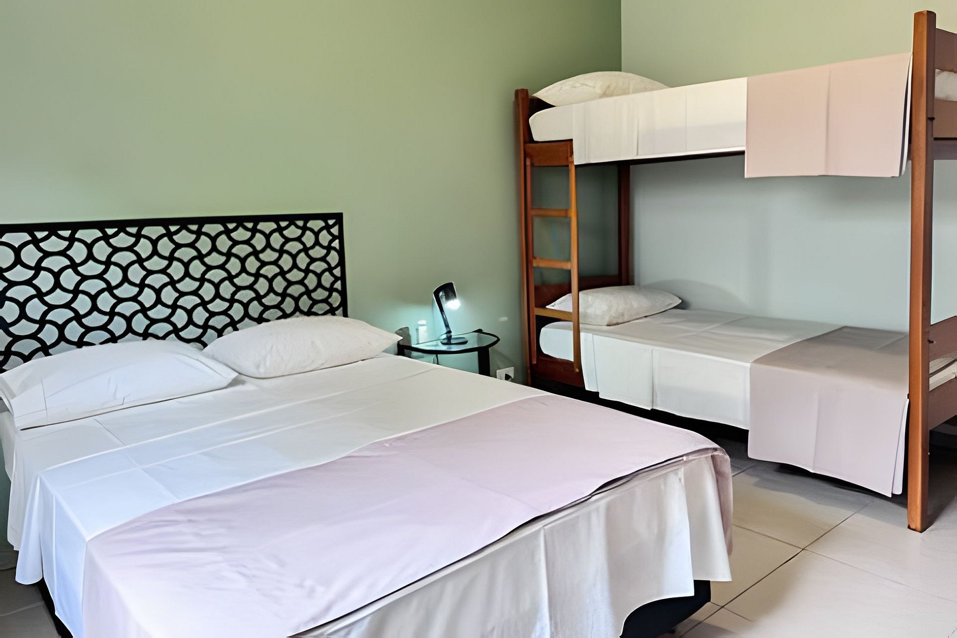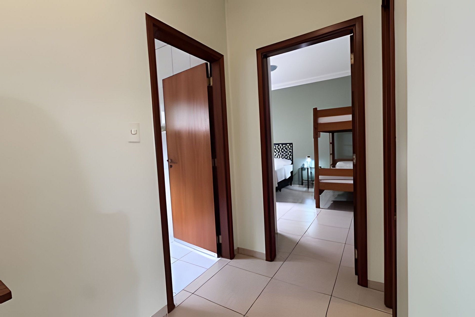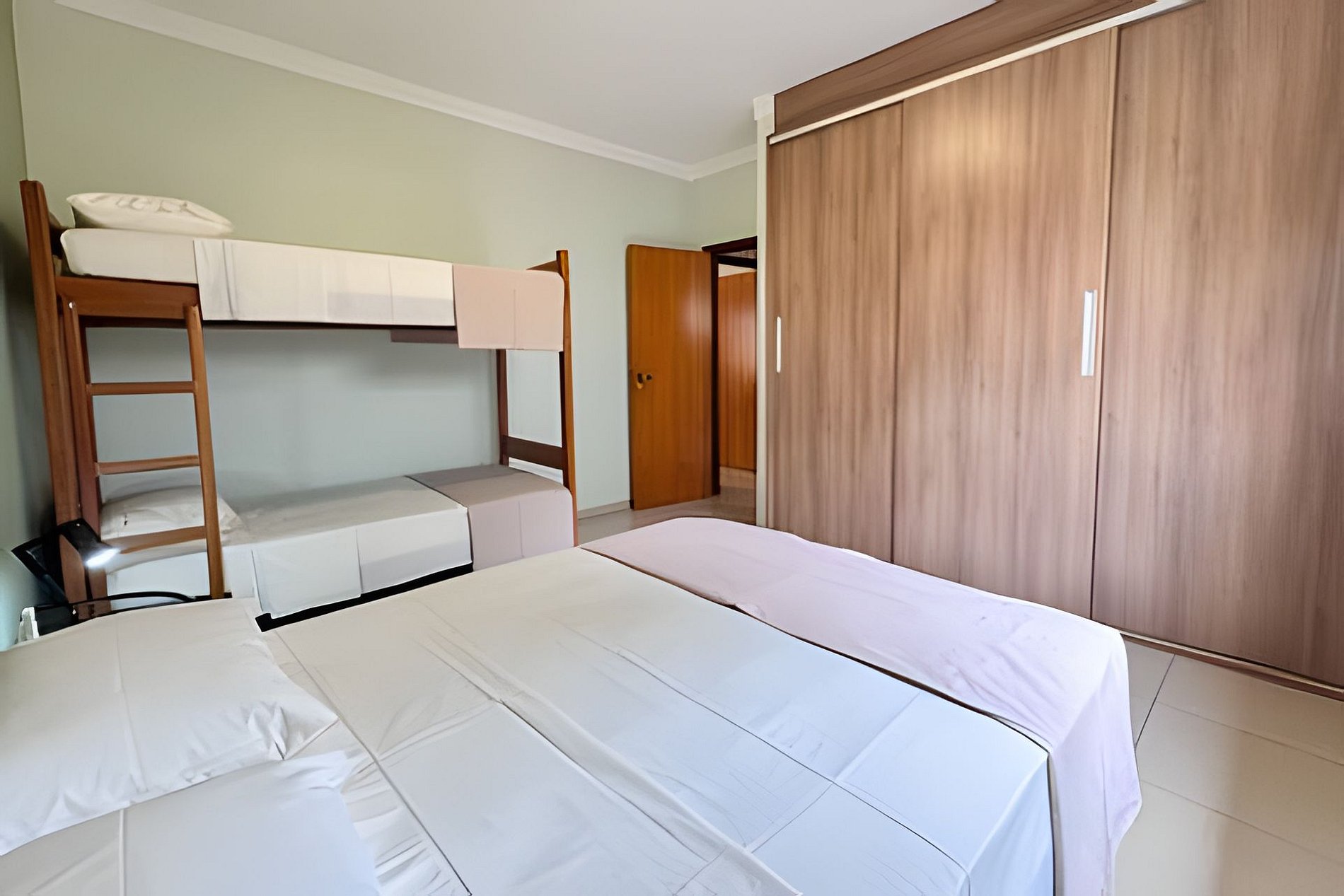 - Dois quartos amplos, idênticos, sendo que cada um possui uma cama de casal, uma beliche, ar condicionado, mesa de cabeceira com luminária e armário espaçoso com cabides à disposição dos hóspedes.