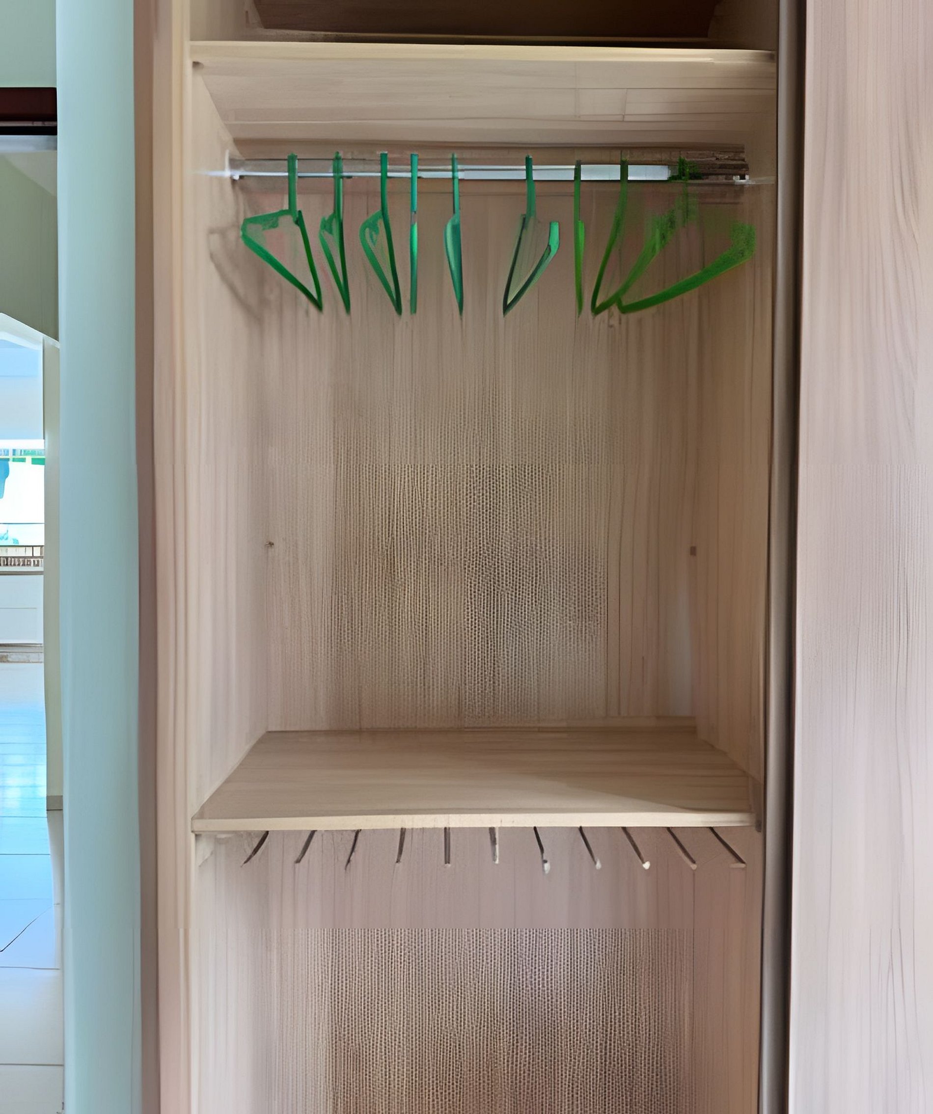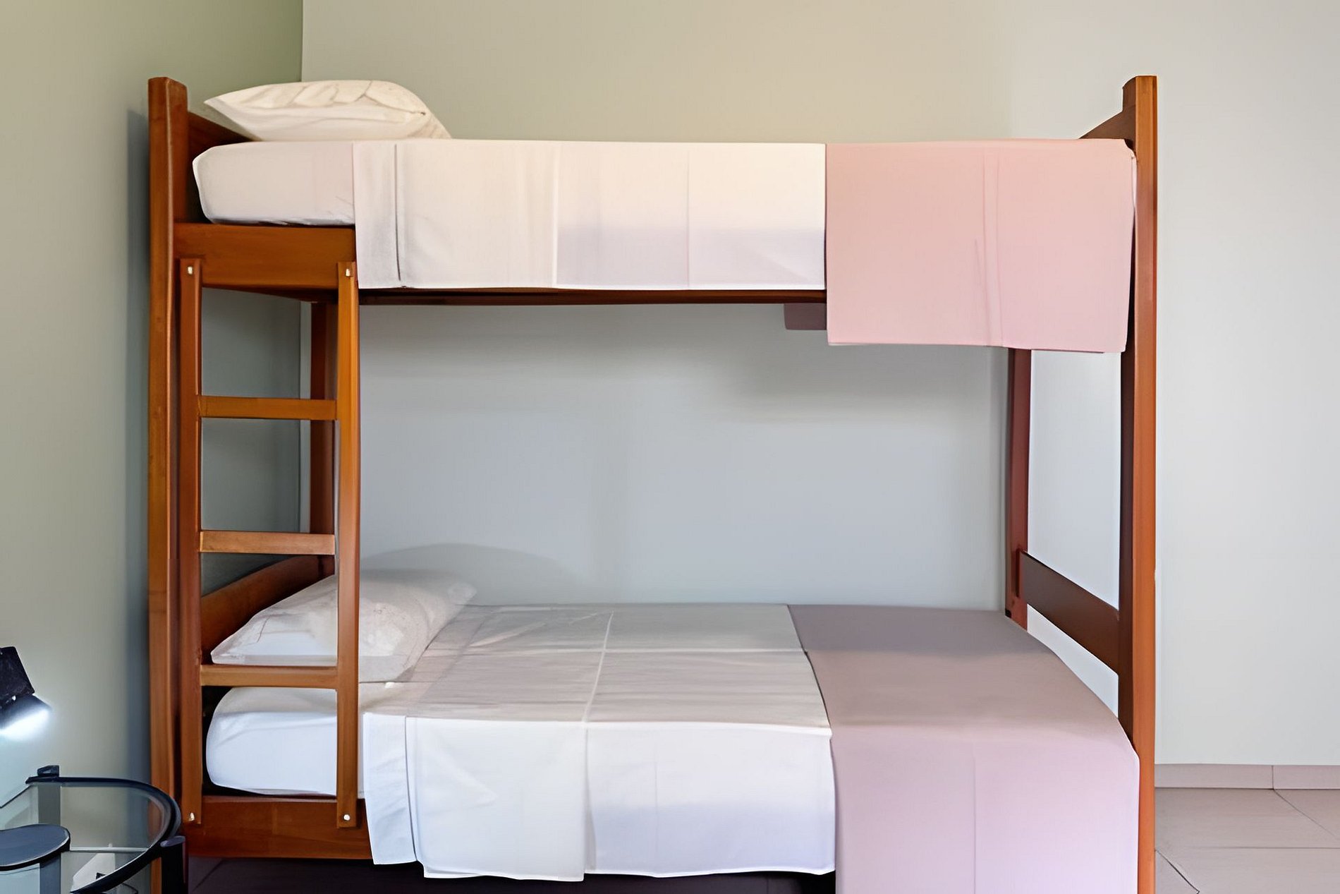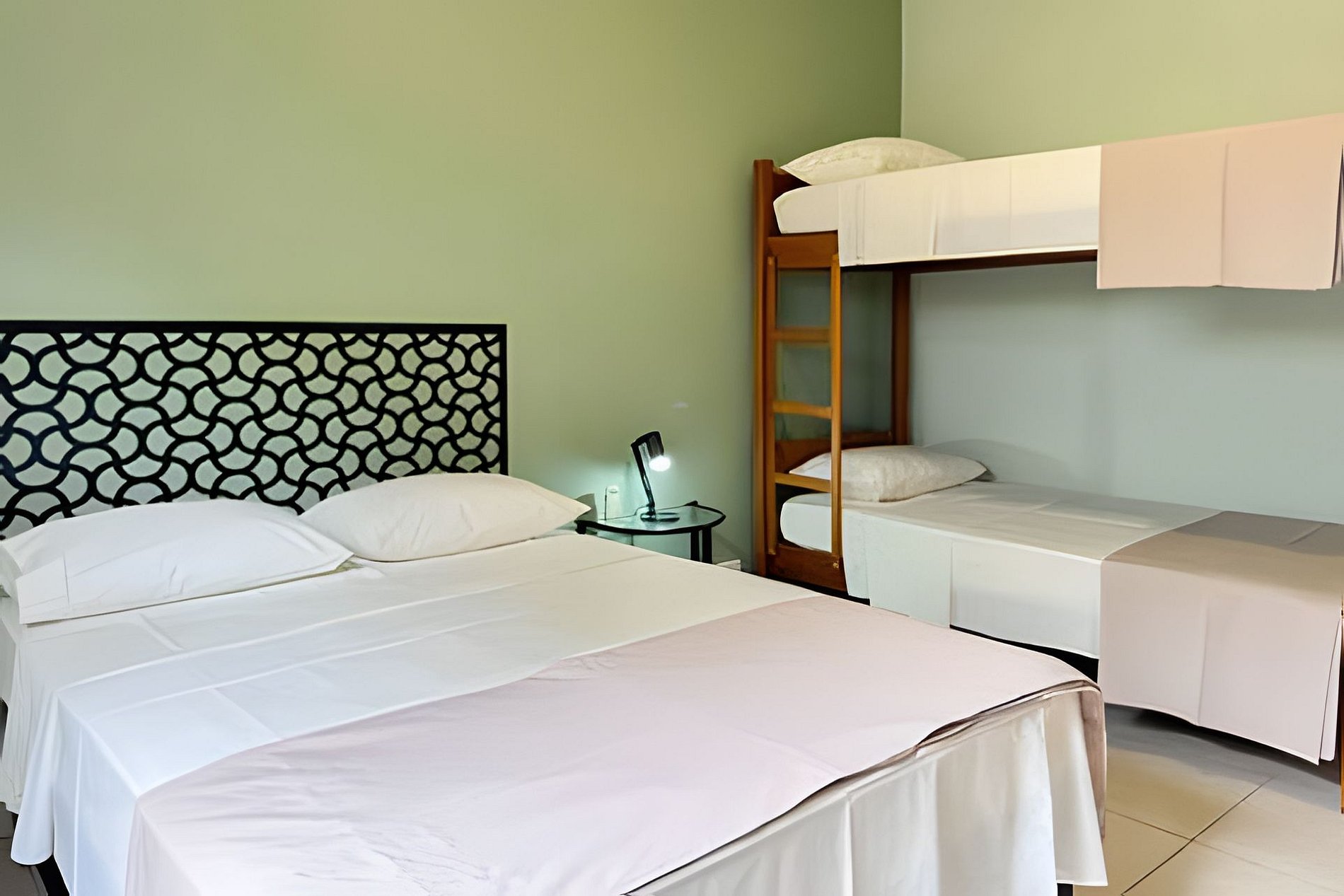 - Dois quartos amplos, idênticos, sendo que cada um possui uma cama de casal, uma beliche, ar condicionado, mesa de cabeceira com luminária e armário espaçoso com cabides à disposição dos hóspedes.
