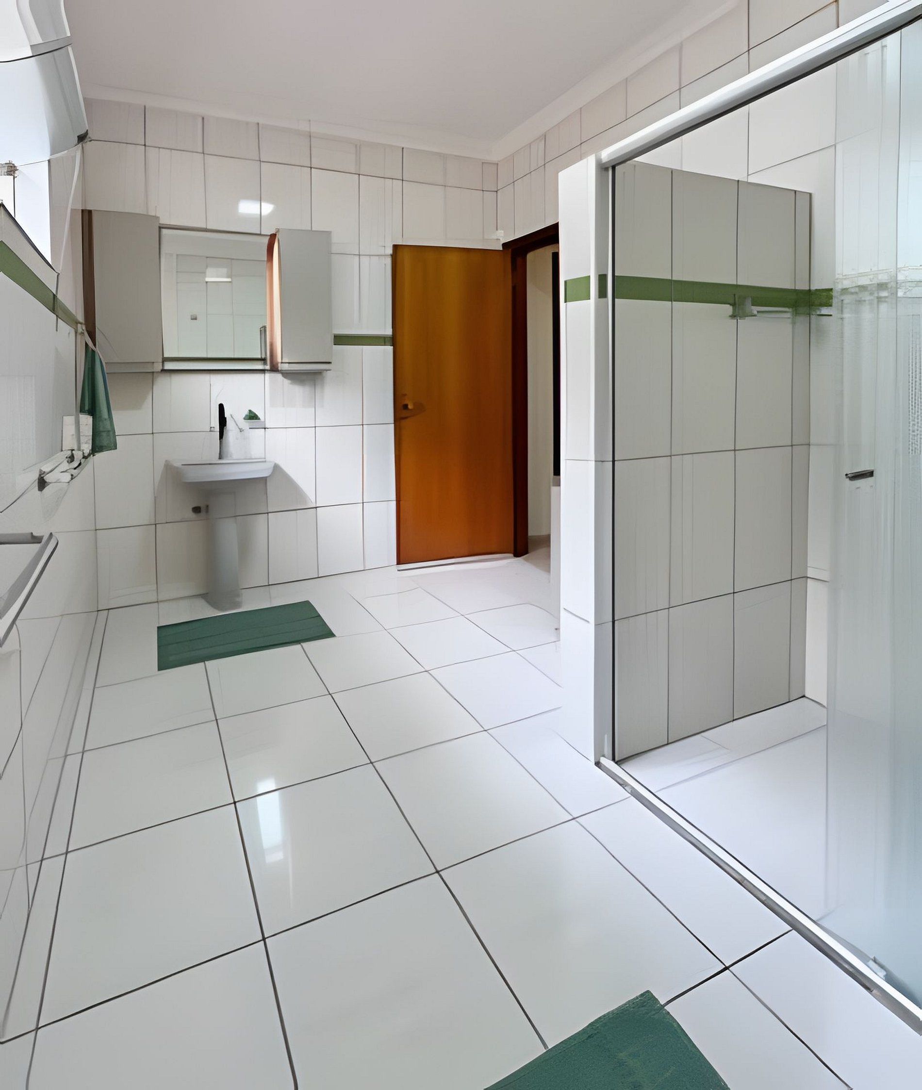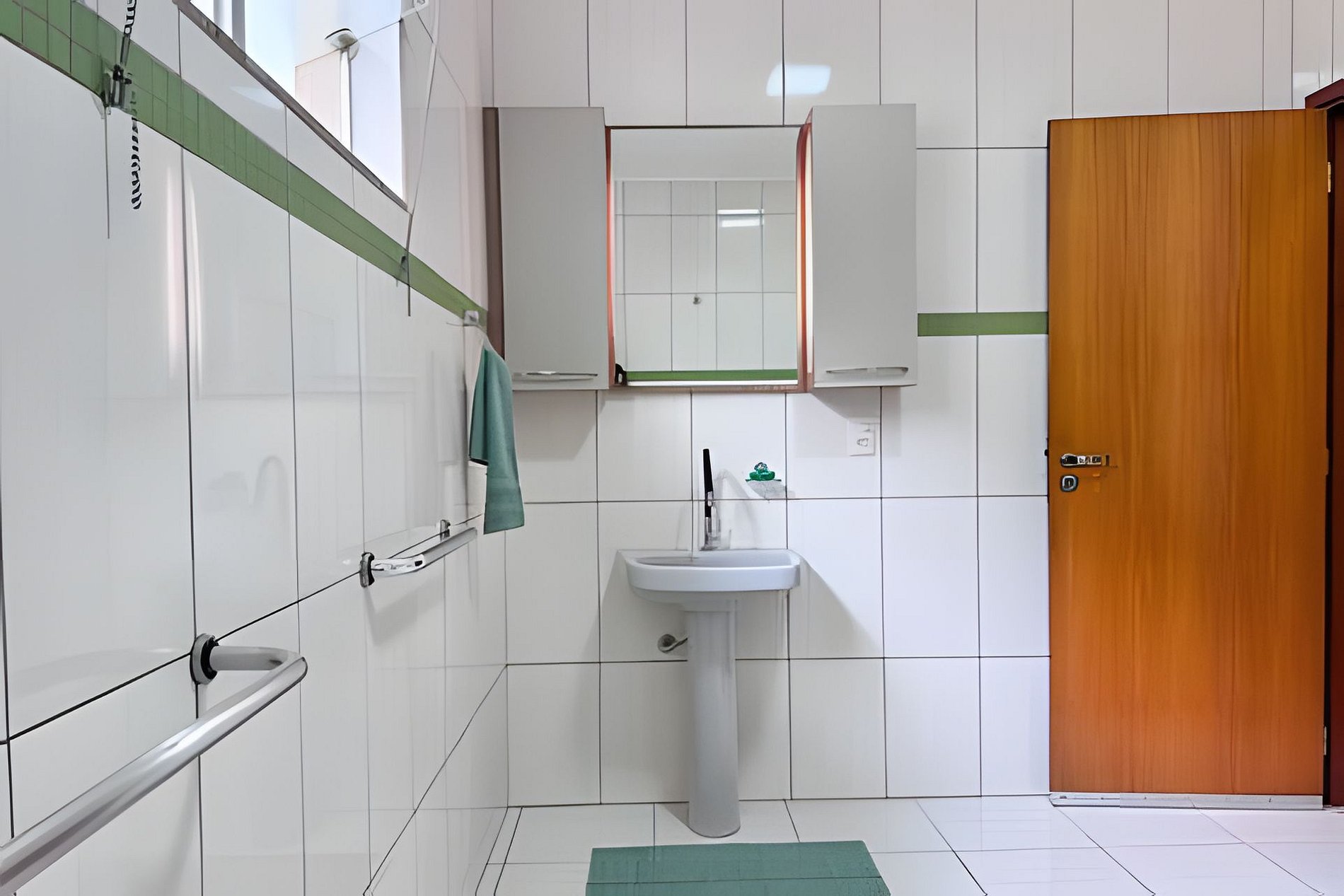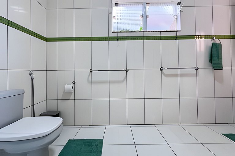 A casa é toda térrea, sem degraus, com portas e passagens amplas (80 cm ou mais), promovendo completa acessibilidade.