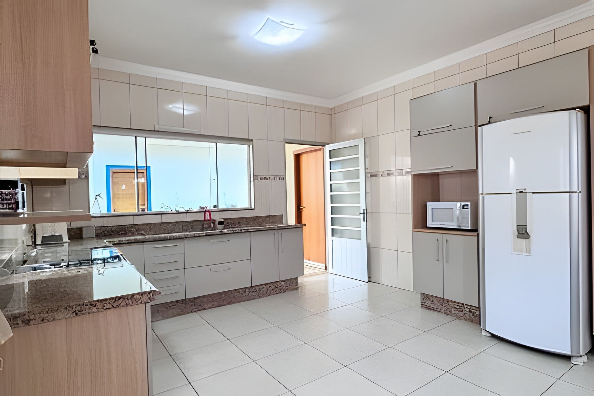 A casa possui: - Sala de estar com ar condicionado, sofás e tv; - Dois quartos amplos, idênticos, sendo que cada um possui uma cama de casal, uma beliche, ar condicionado, mesa de cabeceira com luminária e armário espaçoso com cabides à disposição dos hóspedes. - Banheiro amplo entre os quartos; - Copa e cozinha completíssimas, espaçosas, com louças, copos, taças, xícaras, pratos, microondas, cafeteira, geladeira, fogão 6 bocas, liquidificador, espremedor de sucos, tudo funcionando perfeitamente; - Área externa com mais uma mesa com cadeiras de madeira; - Lavabo; - Garagem para dois carros.
