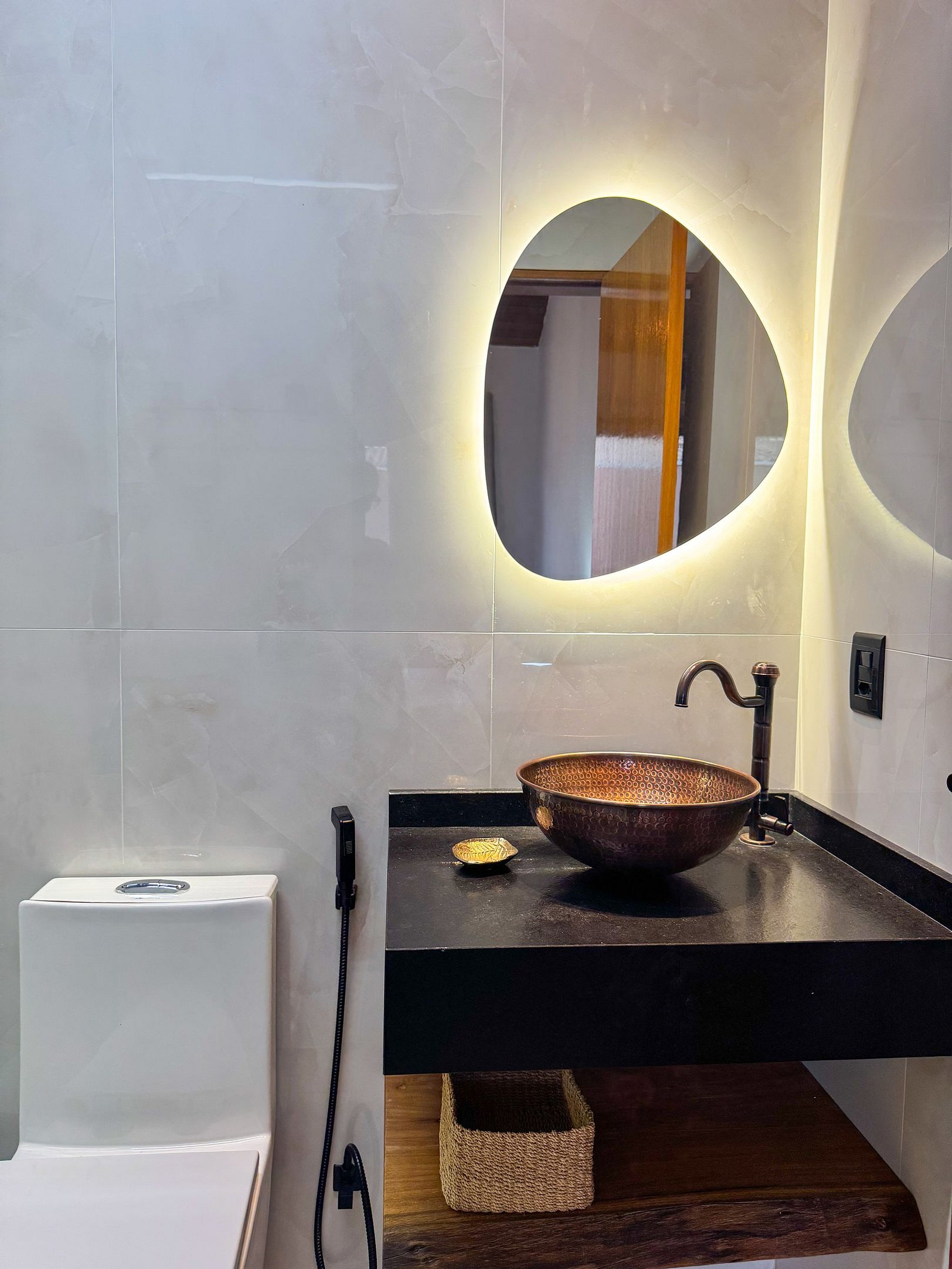 • Banheiro moderno com acabamento rústico-chique
