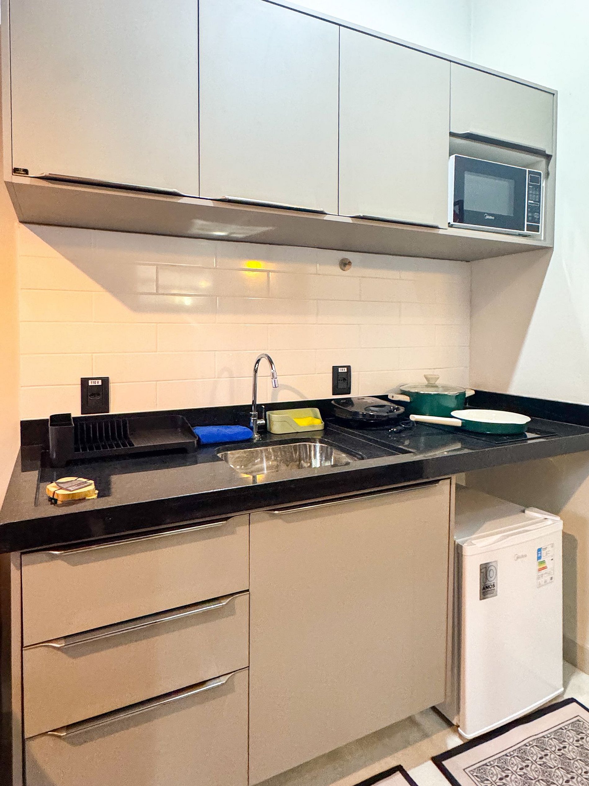 • Cozinha equipada com fogão de indução, micro-ondas, frigobar e utensílios