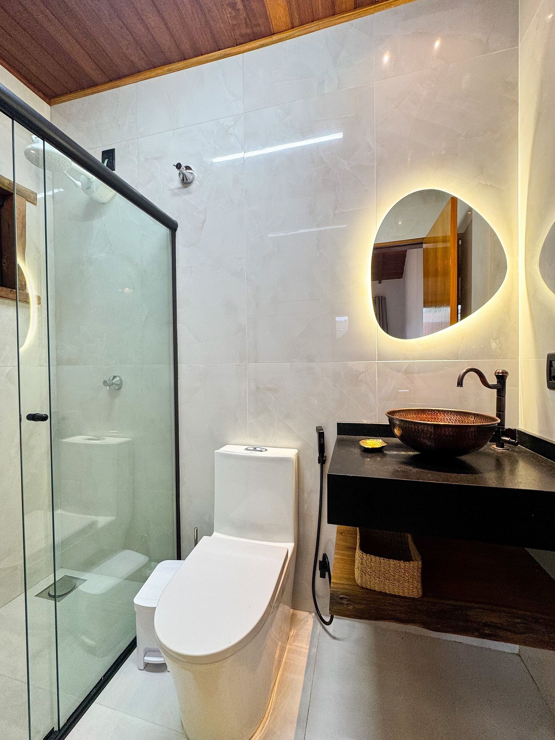 • Banheiro moderno com acabamento rústico-chique
