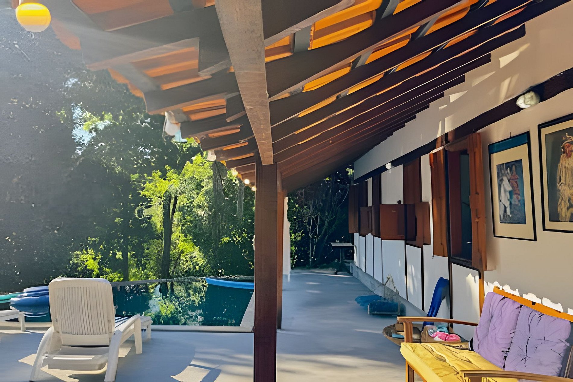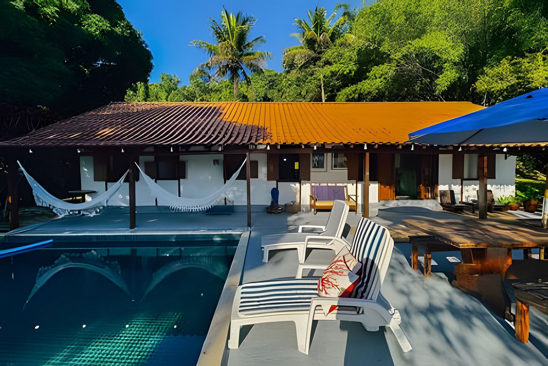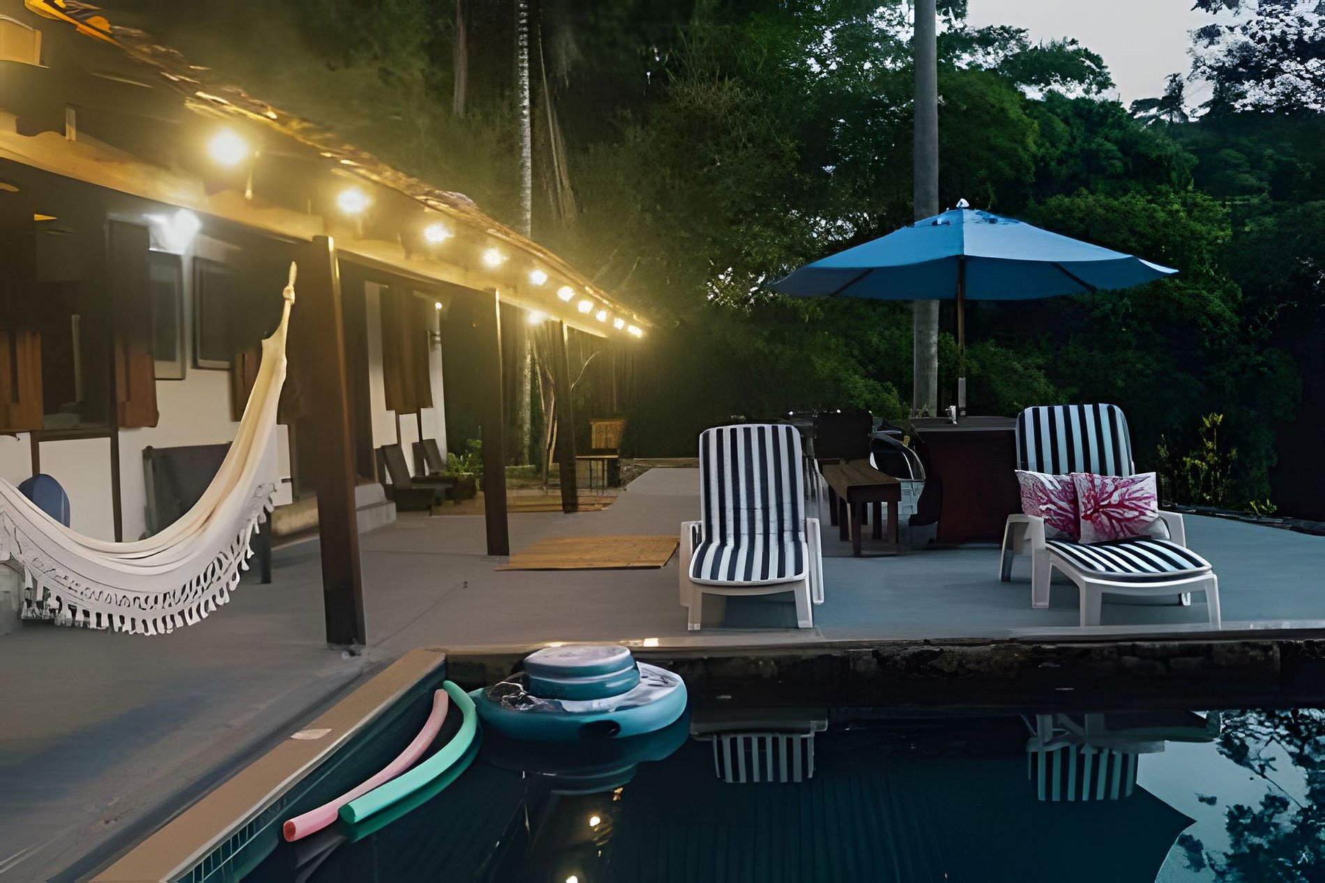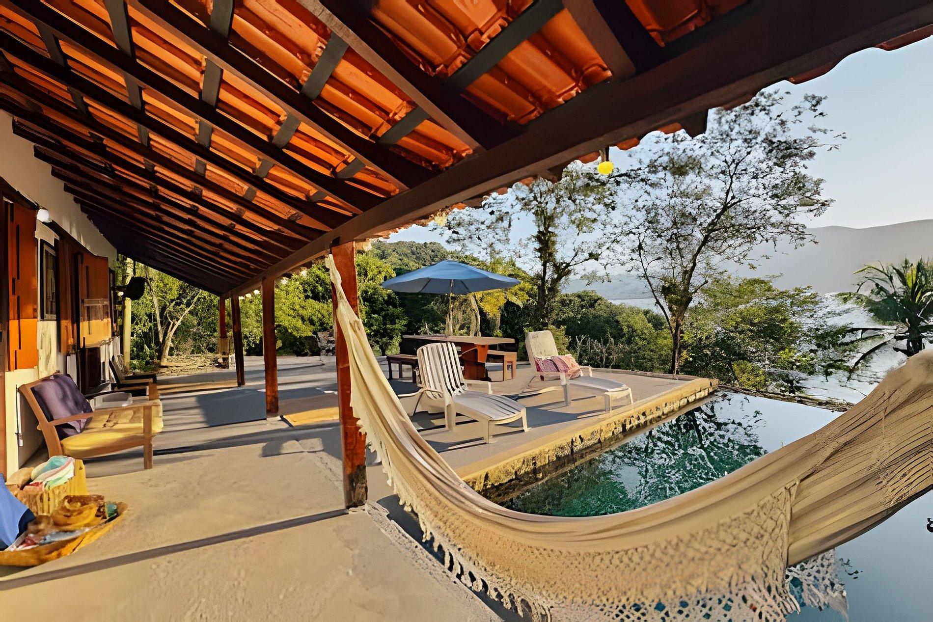 - redes, espreguiçadeiras, cadeiras de descanso e mesas na varanda, no quintal e no deque;