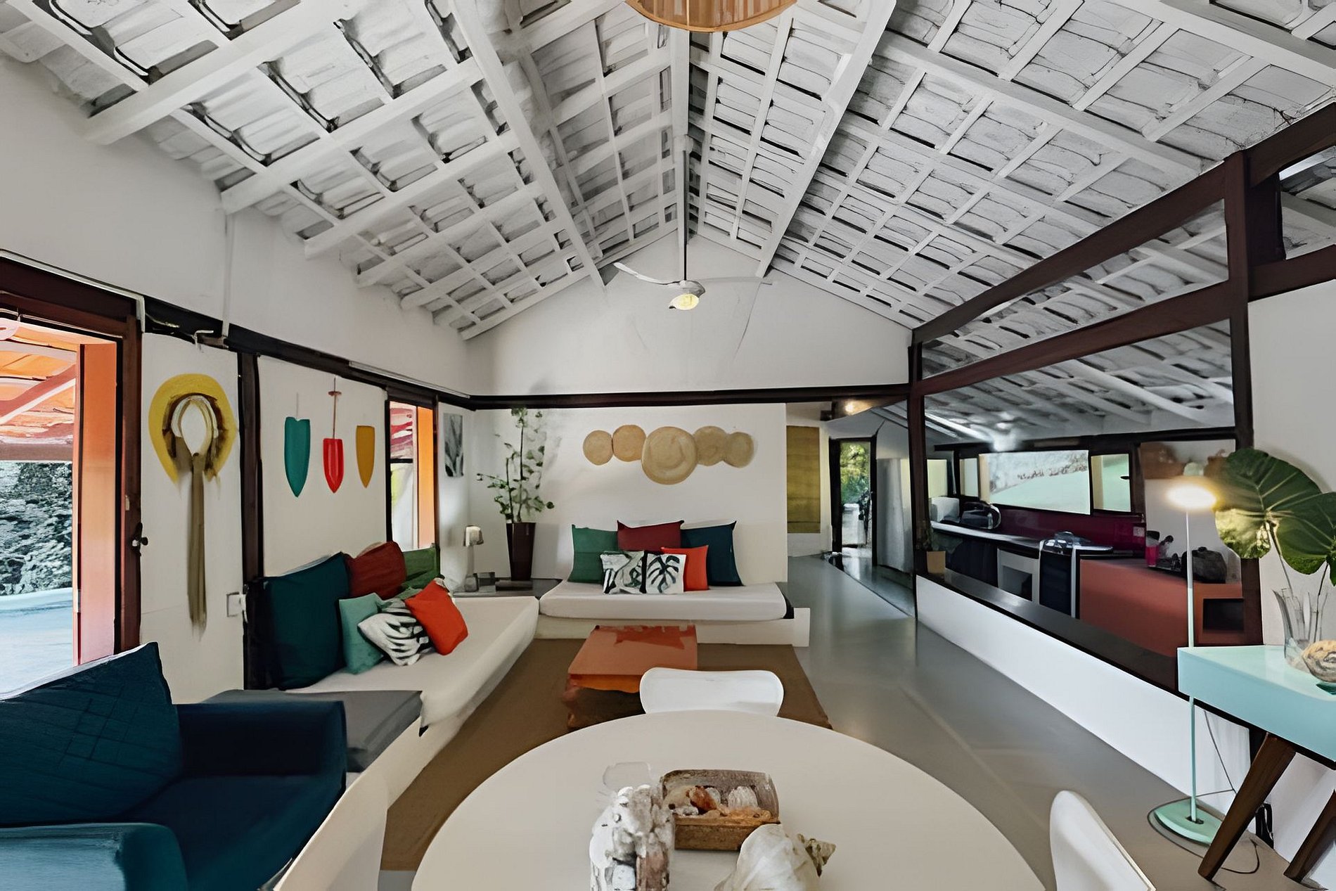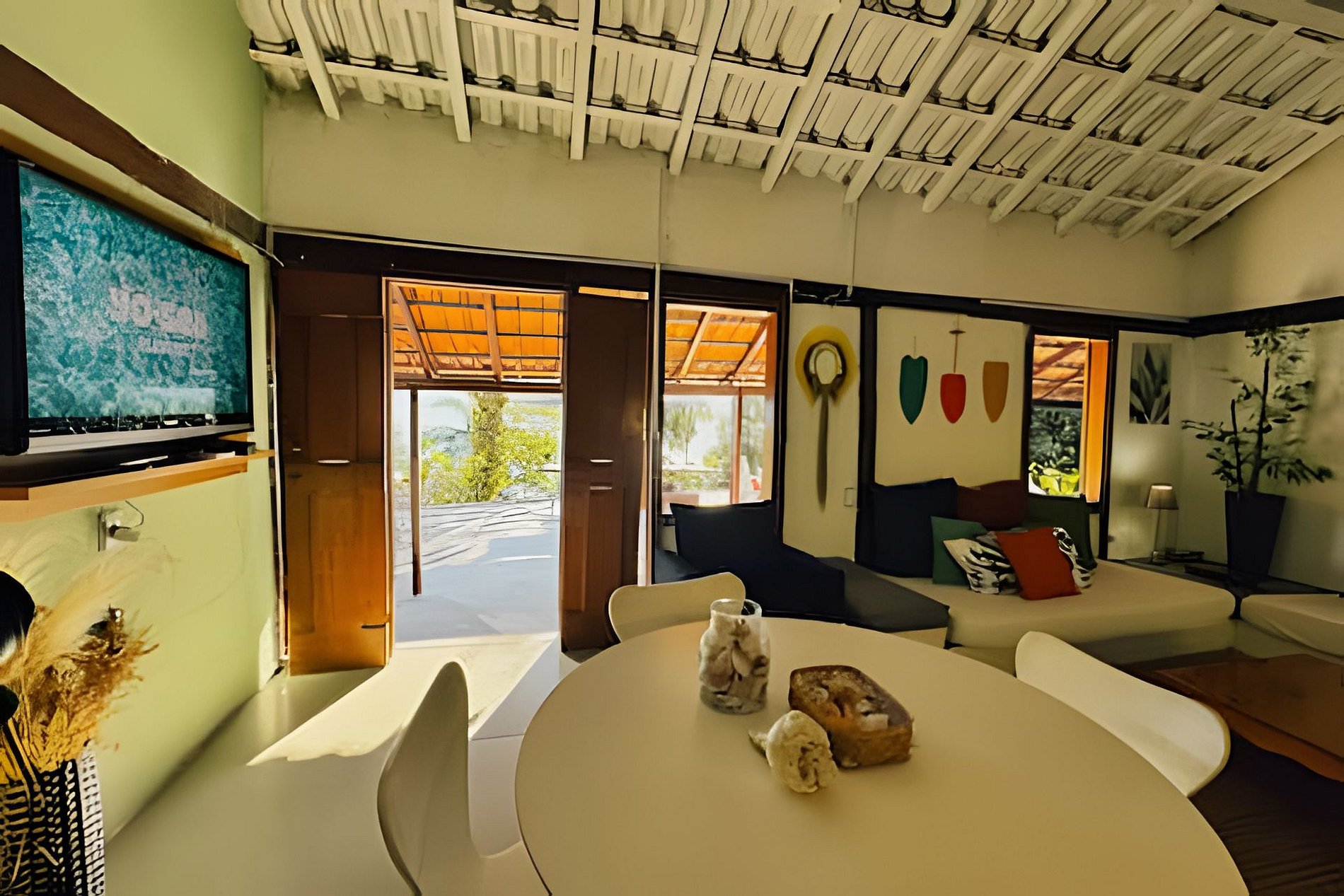 - sala ampla com sofás, mesa de jantar e tv;