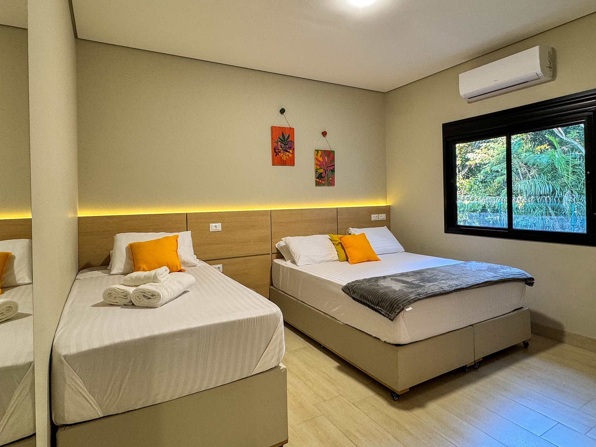A casa dispõe de 4 suítes com entradas independentes, proporcionando privacidade total. Todas contam com camas confortáveis, enxoval de qualidade, ar-condicionado, cortinas blackout, iluminação indireta e espaço para bagagens. Há Smart TV e os banheiros são modernos, amplos e bem iluminados