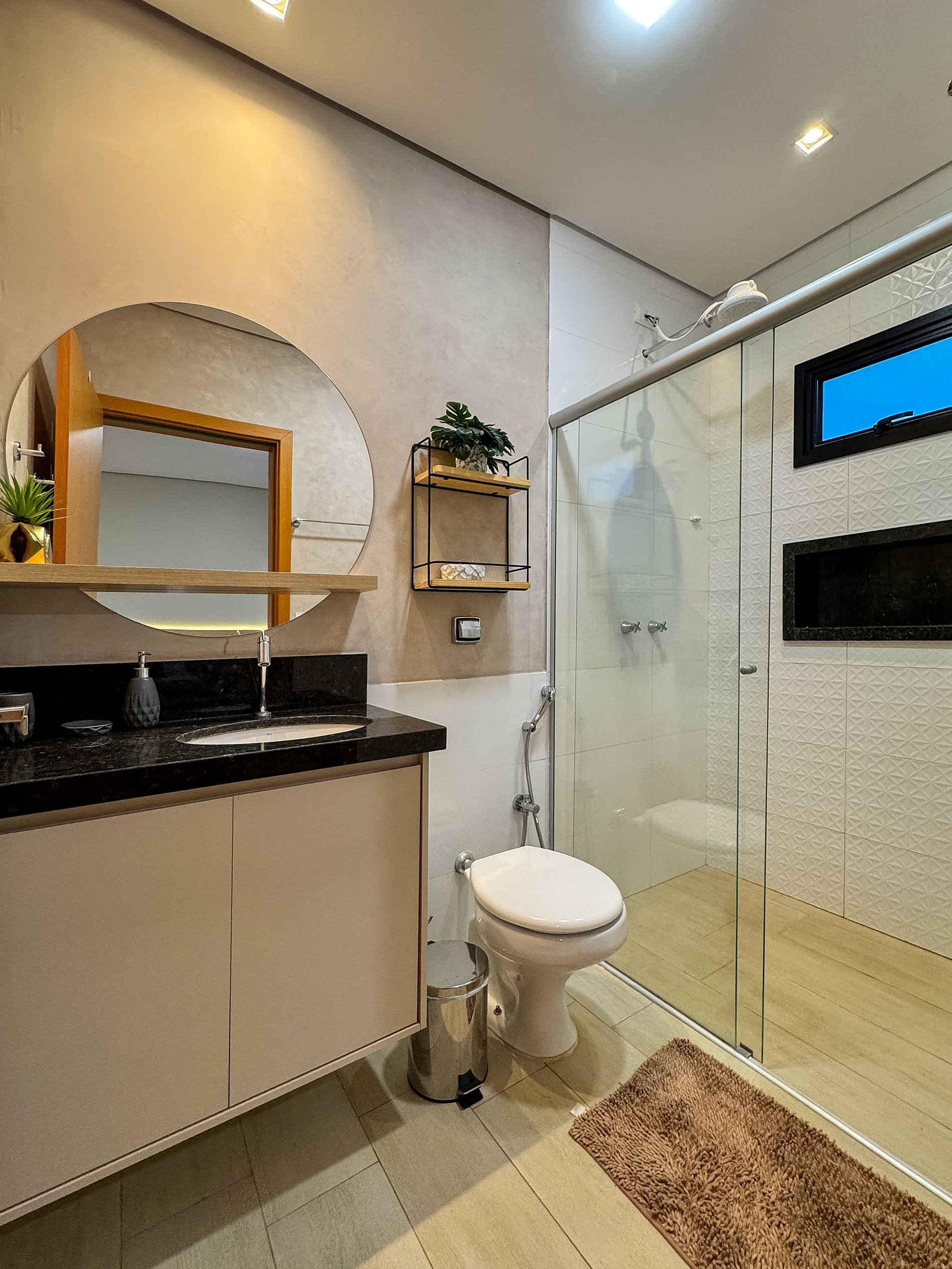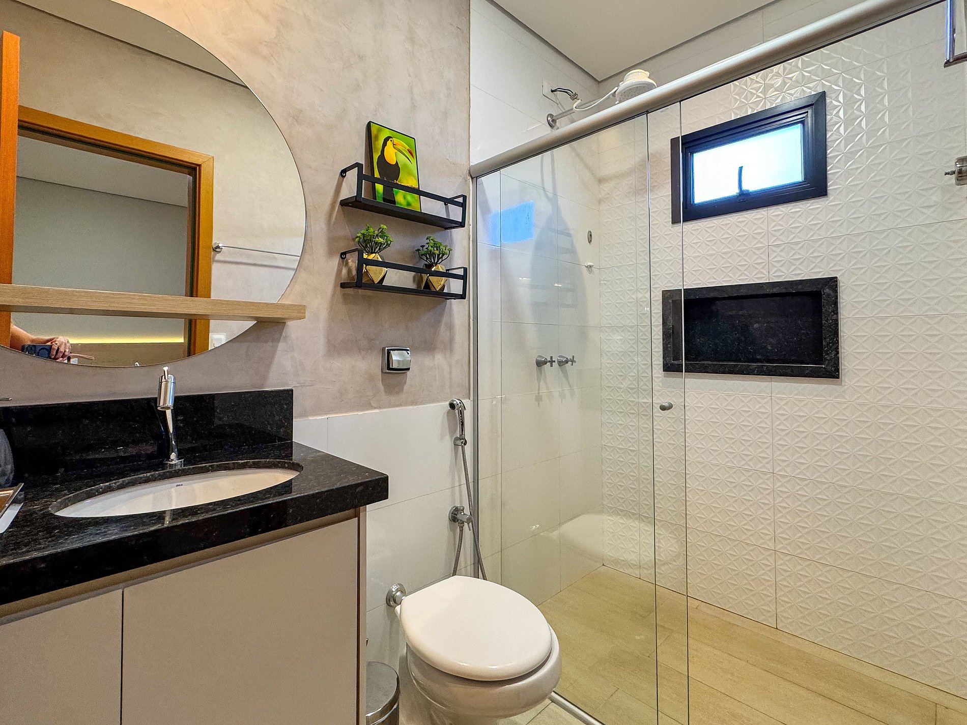 Casa de alto padrão em condomínio fechado em Bonito, ideal para quem busca conforto, lazer, privacidade e contato com a natureza. A área de lazer é um dos grandes destaques, com piscina com hidromassagem e vista para a mata, sauna envidraçada com o mesmo visual e uma ampla área coberta em frente à piscina, equipada com estofados confortáveis, mesa de pebolim, churrasqueira interna e parrilha externa — perfeita para momentos de convivência.