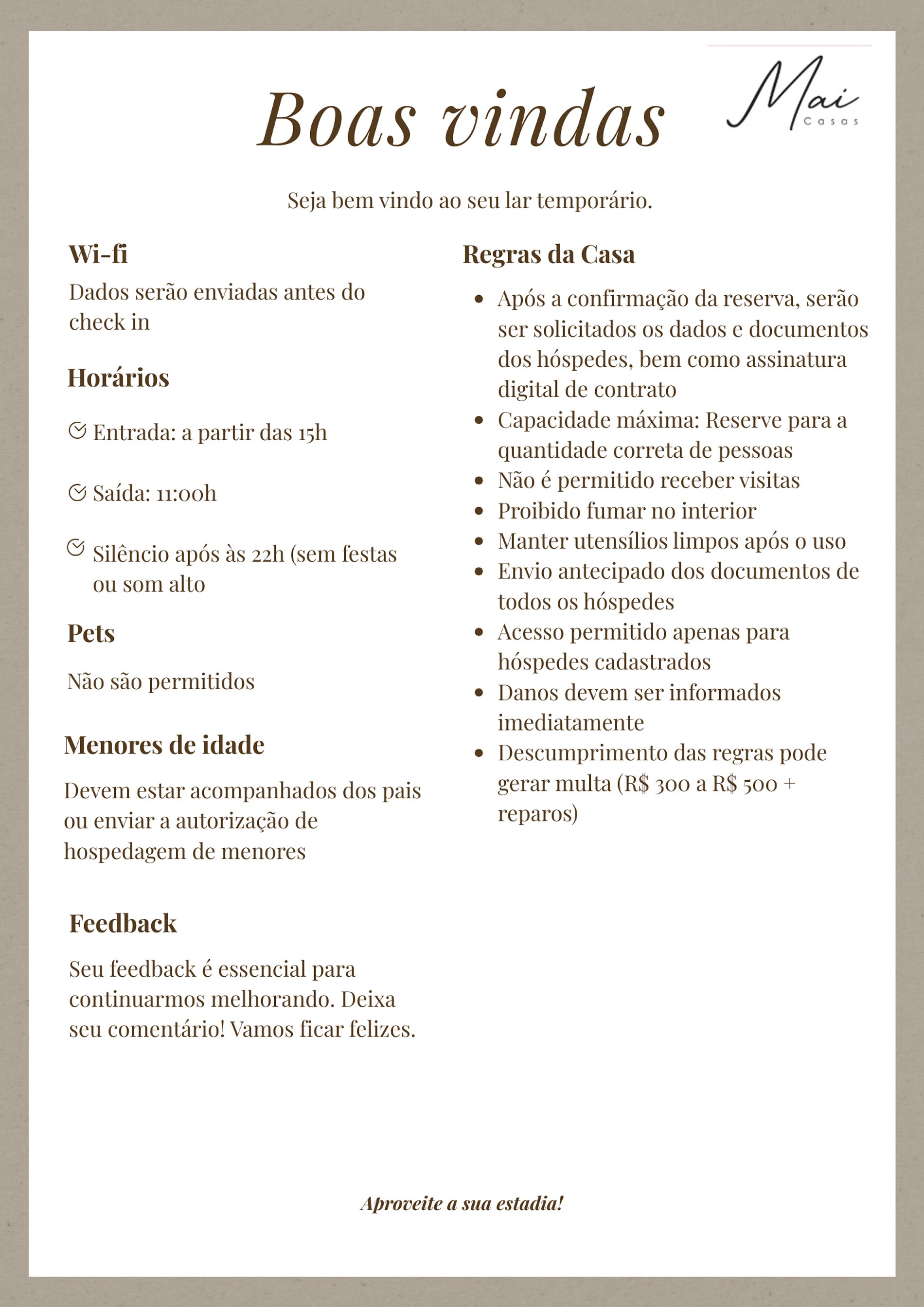Estamos disponíveis antes, durante e após sua reserva, para o que precisar! Aqui você encontra todo o suporte e as dicas de uma anfitriã local. Esperamos que sua estadia seja especial!