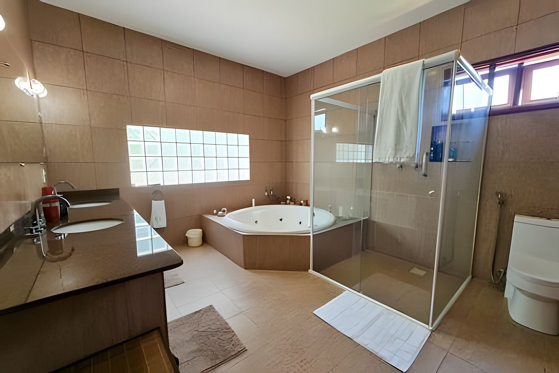 • A casa acomoda confortavelmente até 17 hóspedes, distribuídos em 4 suítes térreas e 1 suíte no piso superior, garantindo privacidade e espaço para todos.