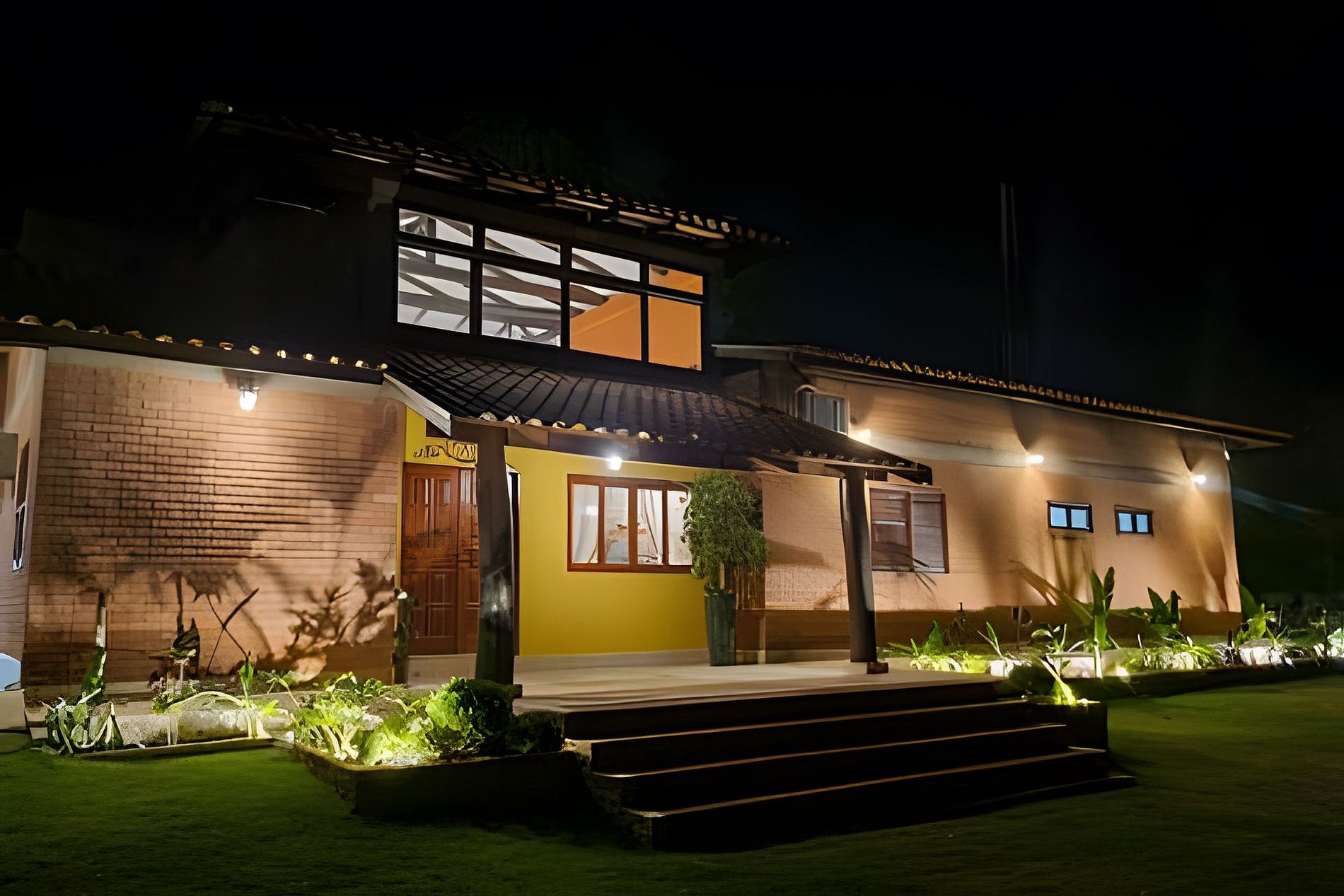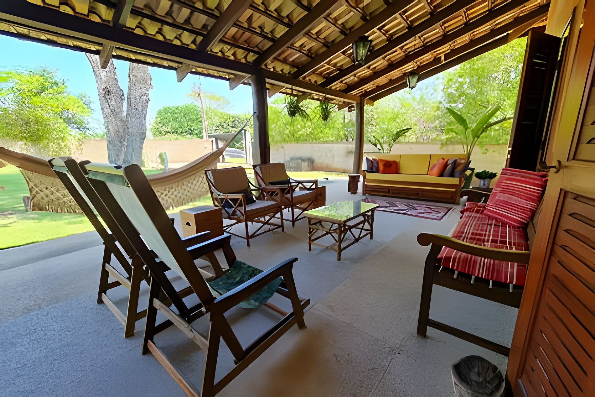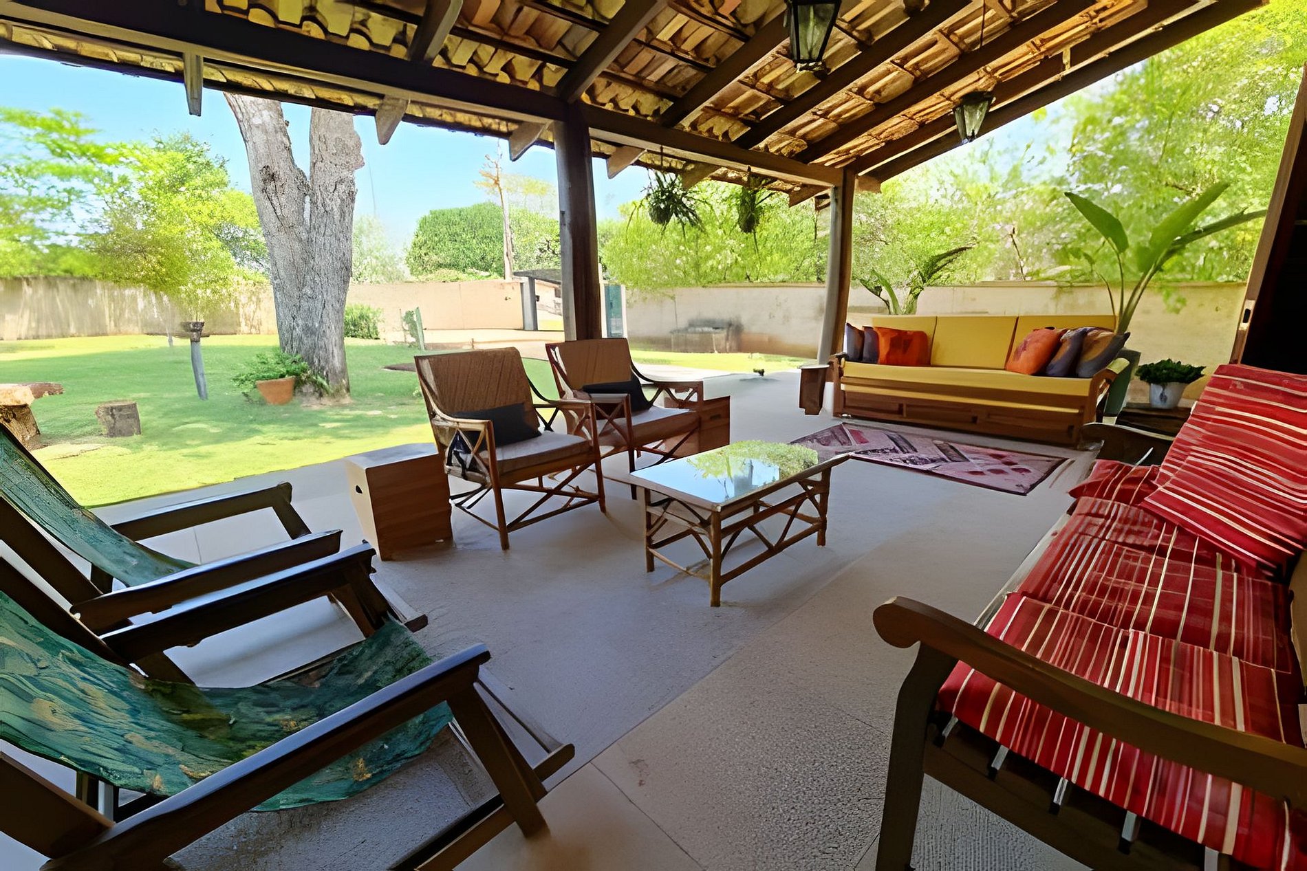 • Na área externa, os hóspedes encontram uma varanda espaçosa com vista para a piscina e para o amplo jardim gramado, que também conta com traves de futebol e rede de vôlei para lazer ao ar livre.