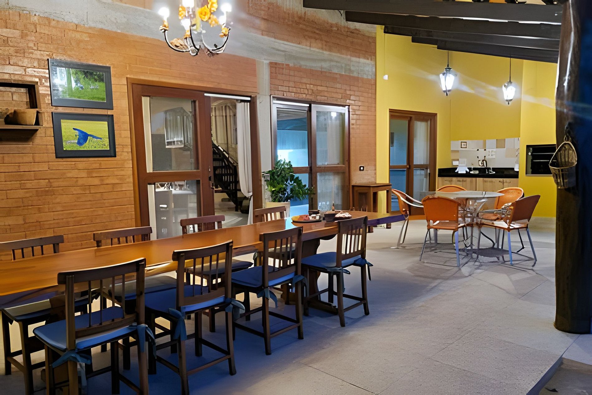 • A propriedade é reservada integralmente para grupos de até 17 pessoas e conta com serviço de diarista incluído, além da possibilidade de solicitar refeições do restaurante da pousada diretamente na casa.