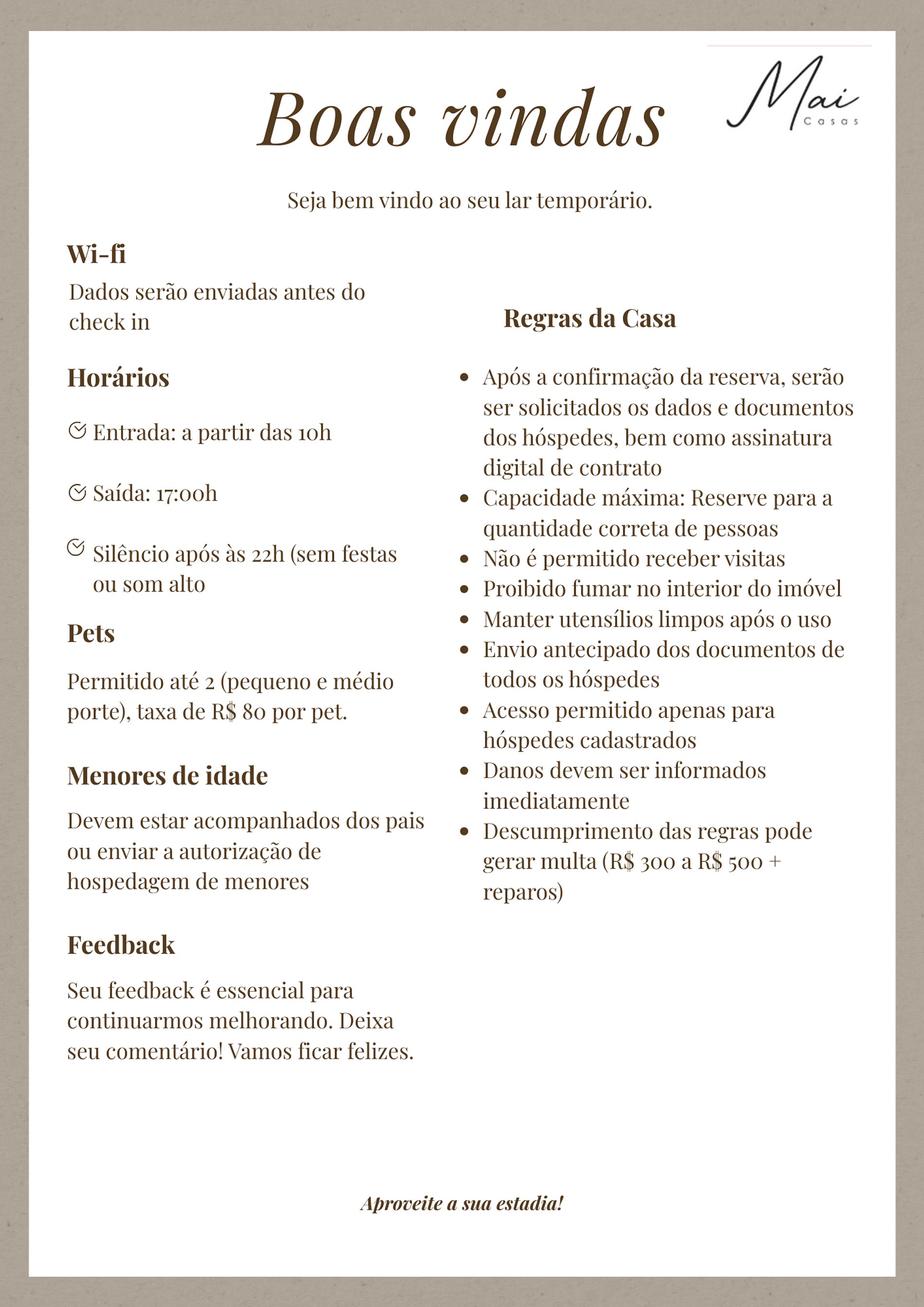 • Pets: até 2 (pequeno porte), taxa de R$ 80 por animal. Fale com a nossa equipe para incluir o 2º pet